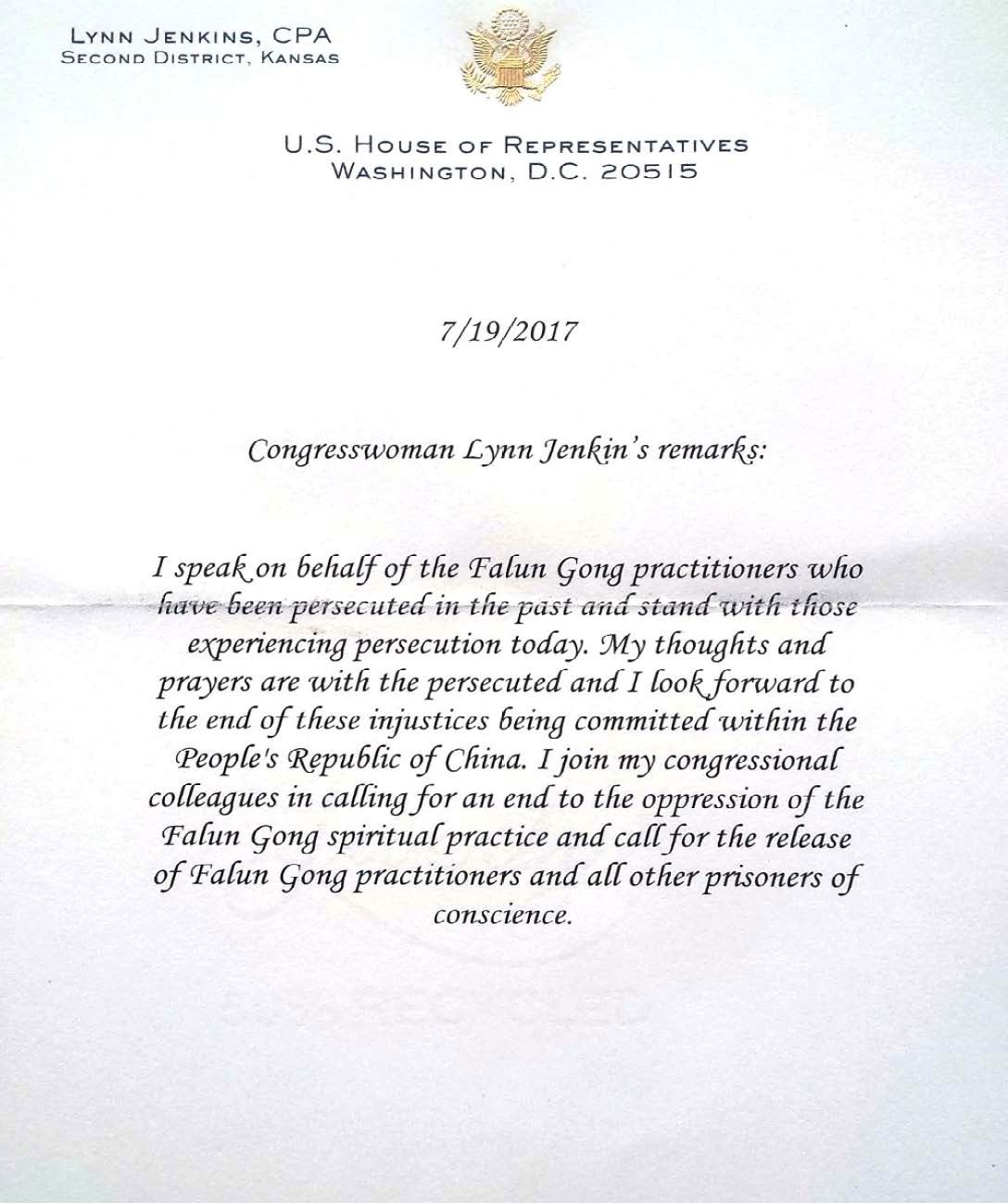 堪萨斯州国会议员琳恩·詹金斯(Lynn Jenkins)在支持信中表示,她是为被迫害的法轮功学员发声,并支持他们。她在信中写道:“我为那些受迫害者祈祷,希望这场在中国的不公镇压早日结束。我与国会同仁一起,要求停止迫害,释放法轮功学员和所有良心犯。”