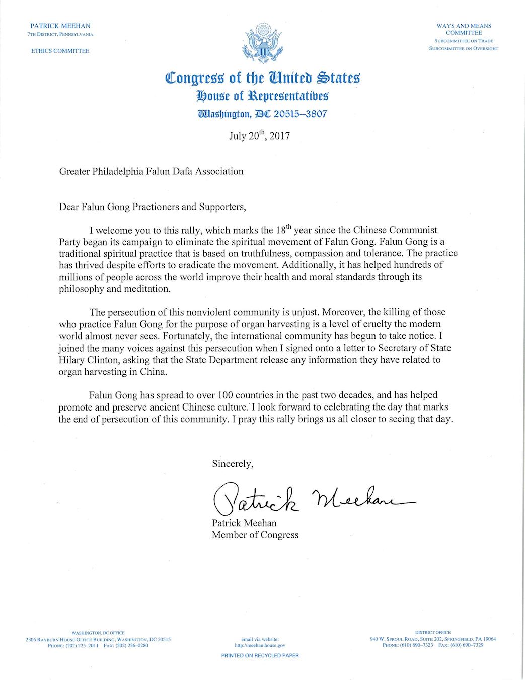 宾夕法尼亚州国会议员帕特里克·米汉(Patrick Meehan)在支持信中说,法轮功在过去的二十多年中传遍了一百多个国家,帮助全世界的亿万人得到身心升华。