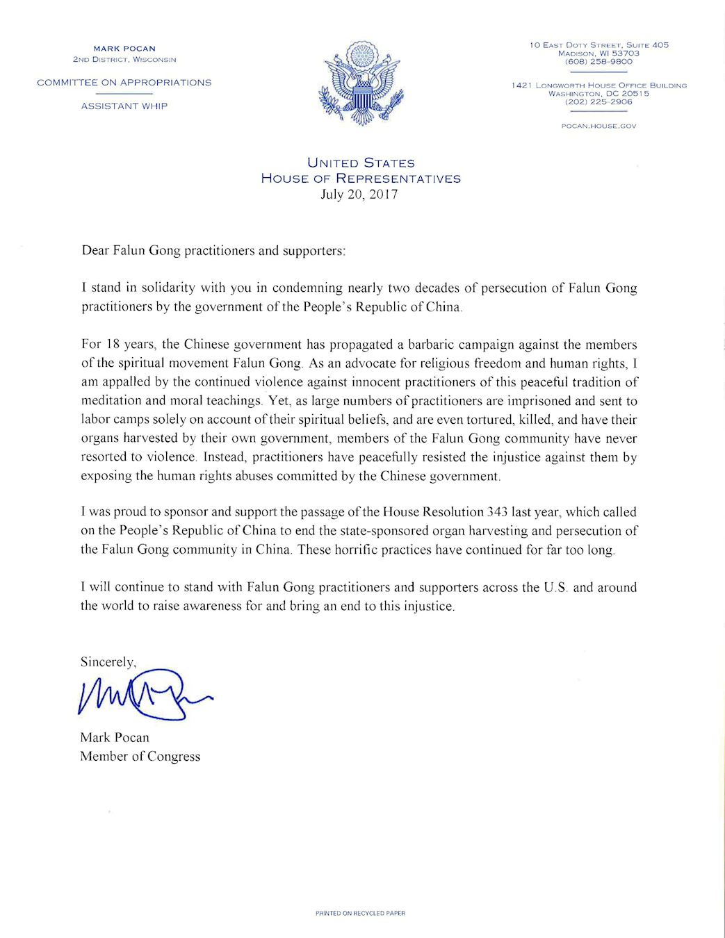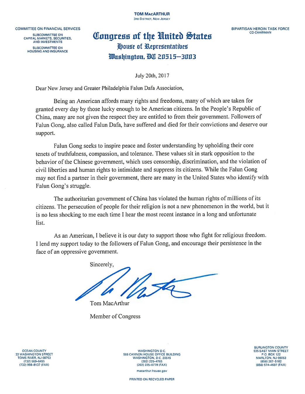 【明慧网二零一七年七月二十三日】在法轮功学员反迫害18周年之际,多位美国国会参、众议员致信声援。