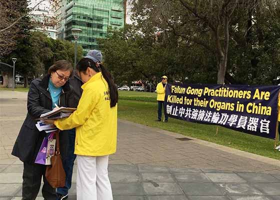 在反迫害十八周年之际,澳大利亚南澳洲首府阿德莱德法轮功学员在市中心介绍功法,揭露中共迫害。