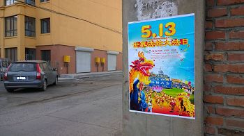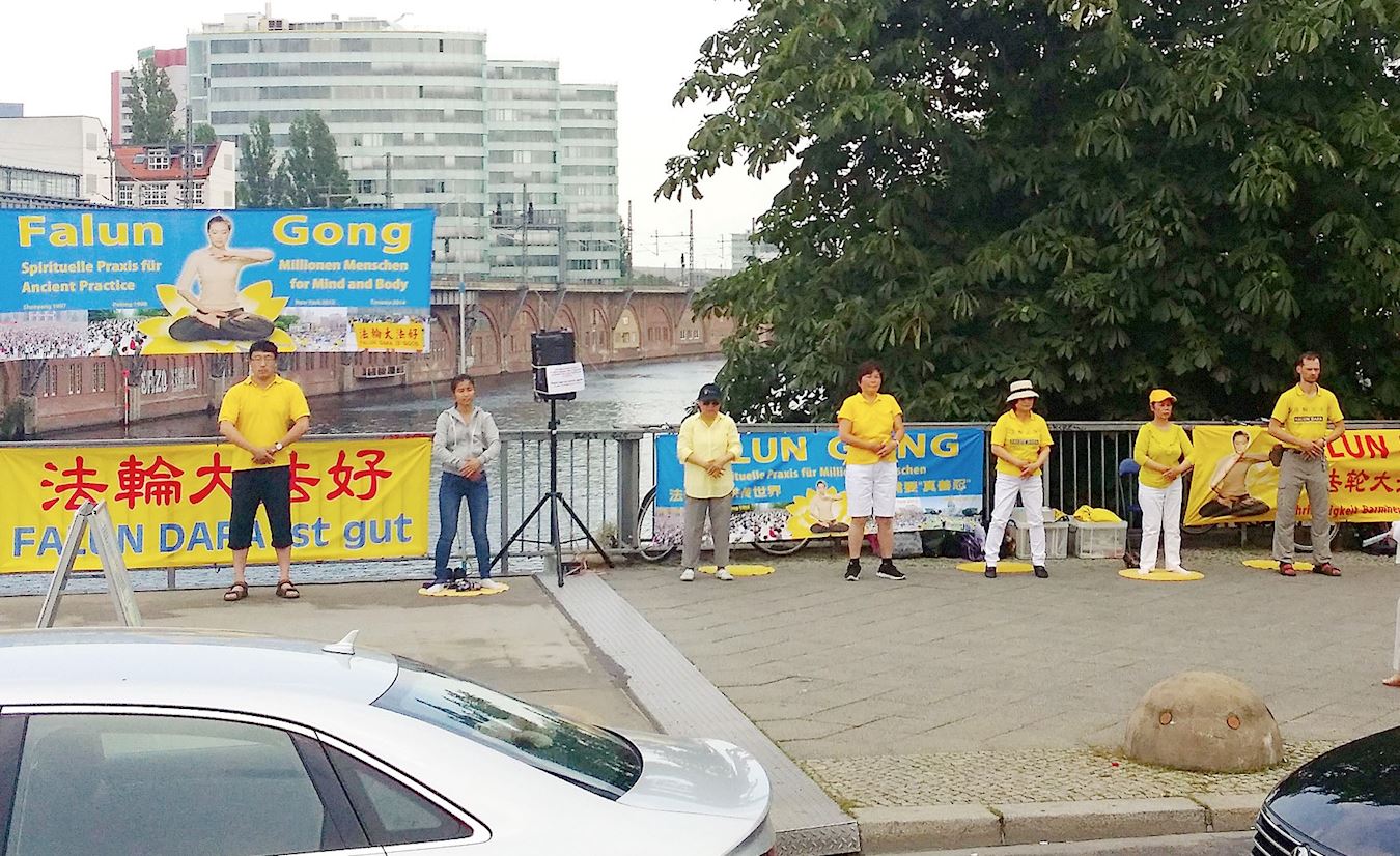 自中共迫害法轮功伊始,柏林几乎每天都有法轮功学员在中使馆前和平抗议。在使馆对面的约诺维茨桥(Jannowitzbrücke)上,当地学员给柏林市民和各国游客展示大型海报,向他们讲述迫害发生的原因及残酷本质,同时有学员展示功法并解释法轮功的内涵。
