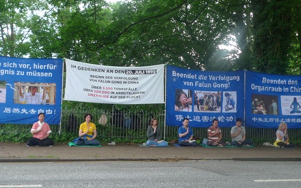 汉堡学员七月二十日当天在中领馆前,从早上六点到夜里二十四点,连续十八个小时举办了和平请愿,呼吁各界关注,共同制止中共迫害法轮功。