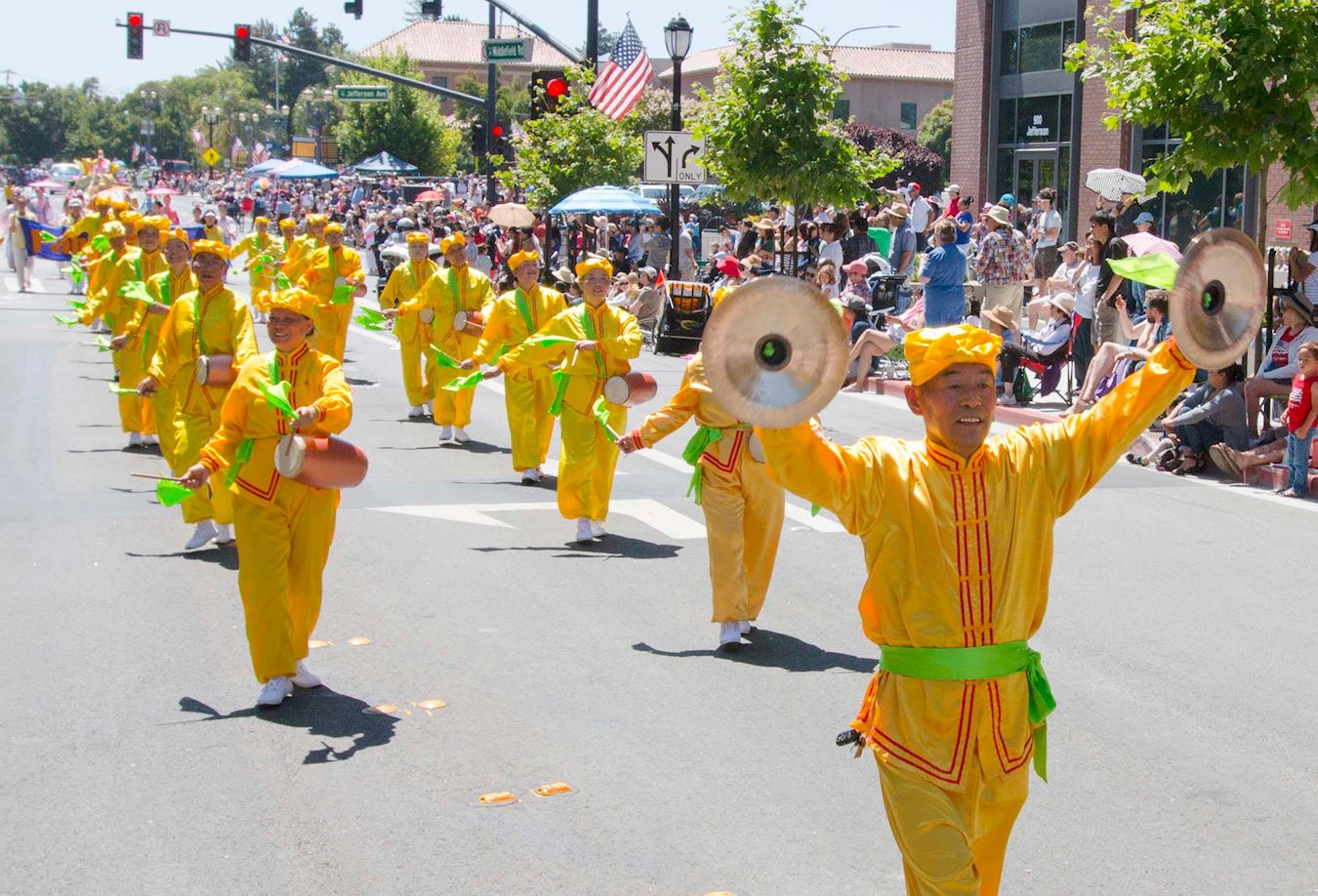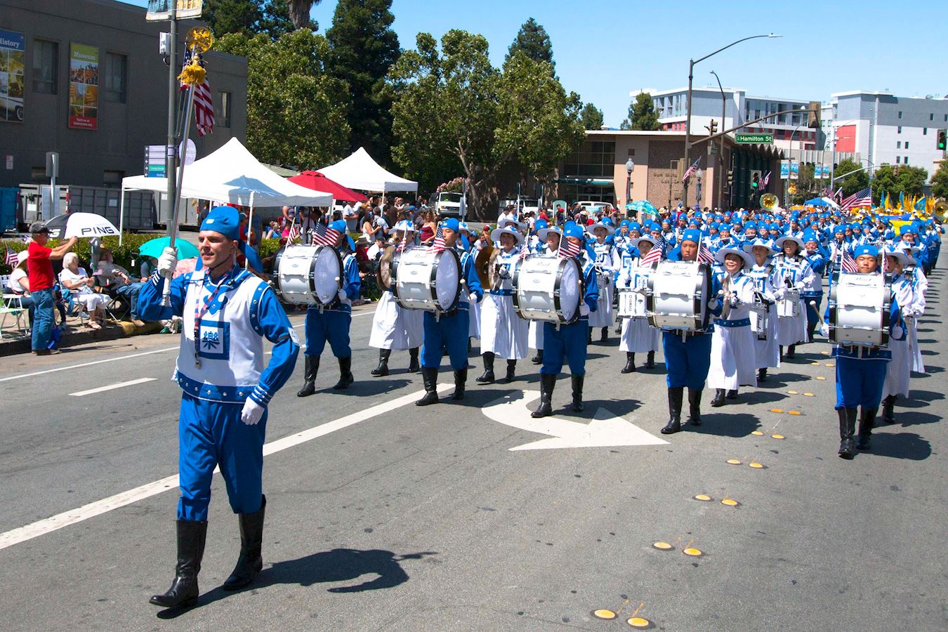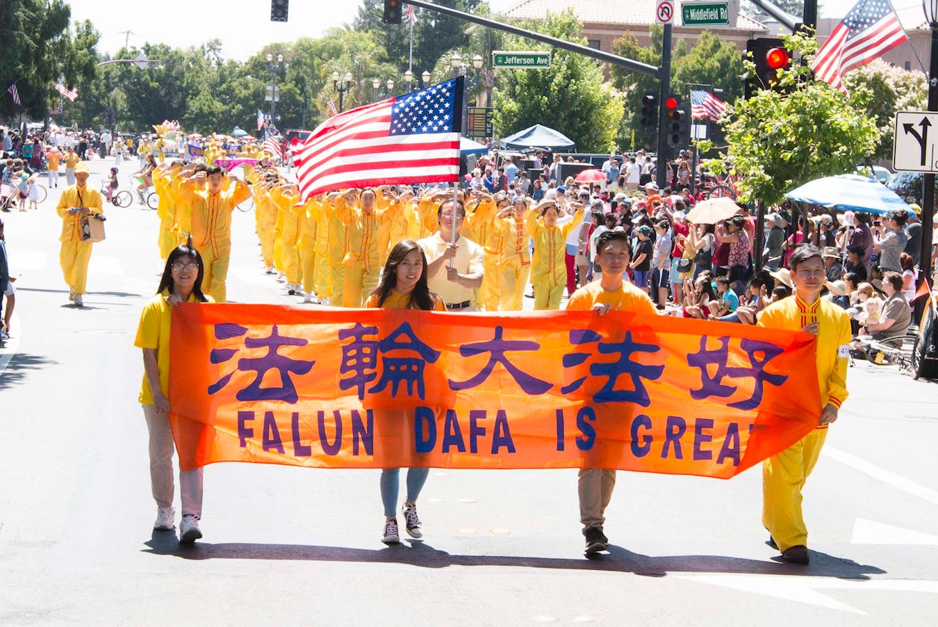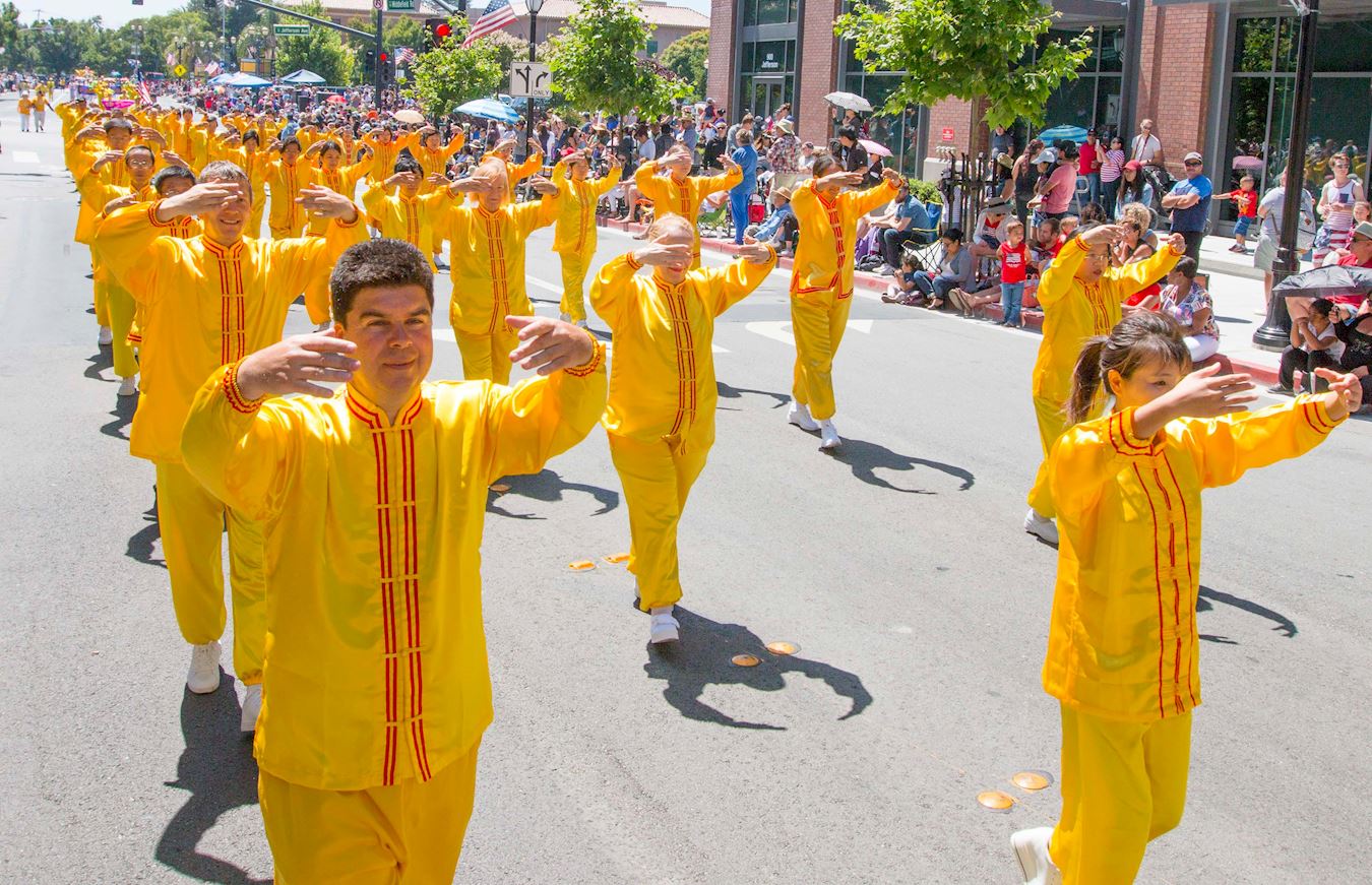 法轮功学员的游行方队由美西天国乐团、旌旗队、炼功队、腰鼓队、舞蹈队和花车组成。今年是腰鼓队第一次参加红木城游行。这次参加红木城游行的法轮功方阵是历年来最大的,气势磅礴。所到之处,人们禁不住鼓掌欢呼、为法轮功的队伍叫好。