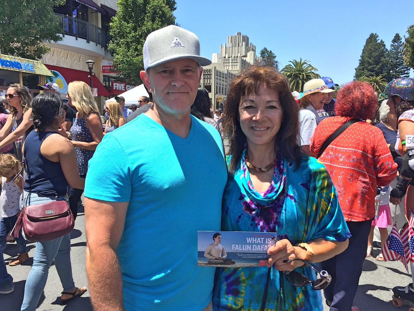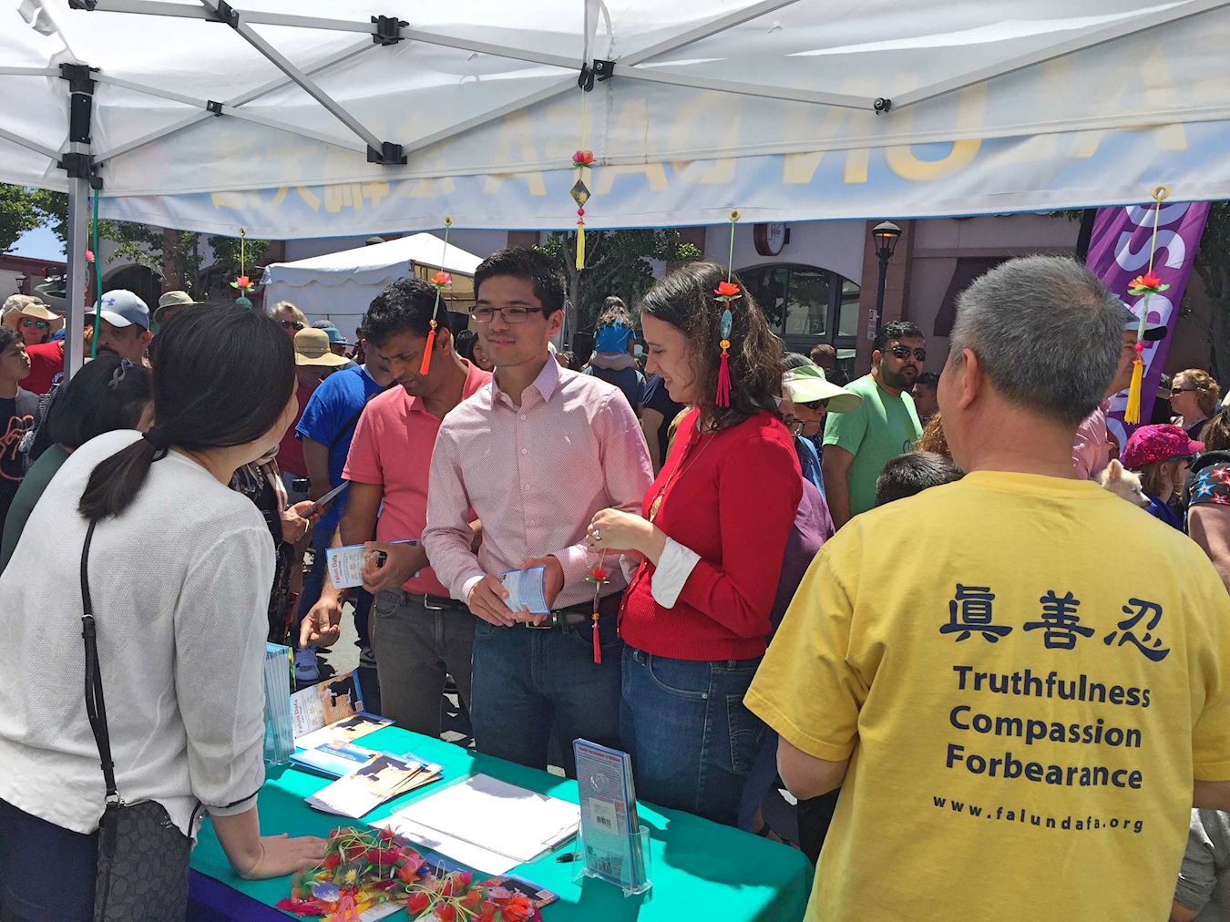 法轮功学员刚把摊位布置好,一位执勤的华人女警对着学员们开怀而笑,并竖起了大拇指。很多参加庆典活动的当地居民被法轮功学员精美的摊位吸引:粉红的大莲花、色彩缤纷的“法轮大法好”精美小挂件、免费教功的横幅、以及中、英、西班牙三种语言的真相资料,不少民众驻足观看。他们有的认真倾听真相,并表示非常认同法轮大法真、善、忍的原则;还有的游客表示对学功感兴趣,拿走了洛杉矶法轮功免费九天班的信息卡片。