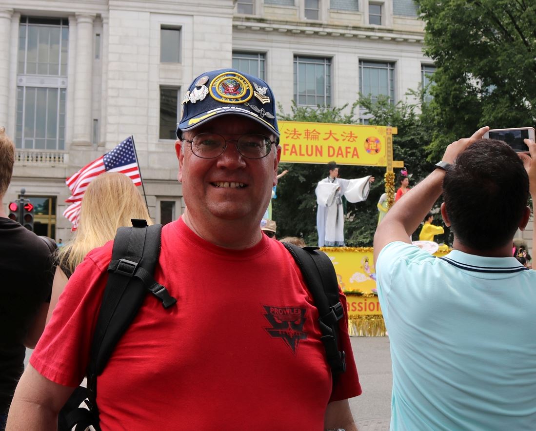 ![]() 图8:在华盛顿特区居住了四十四年的唐纳德·考特臣(Donald Cotchen)先生说:法轮功学员获邀参加美国首都独立日游行,印证了这个国家所崇尚的自由。他们在这里有炼功的自由。 |