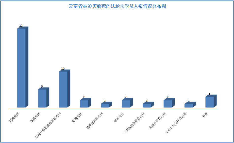 ![]() 图:云南省被迫害致死和在迫害中离世的法轮功学员人数情况分布图 |