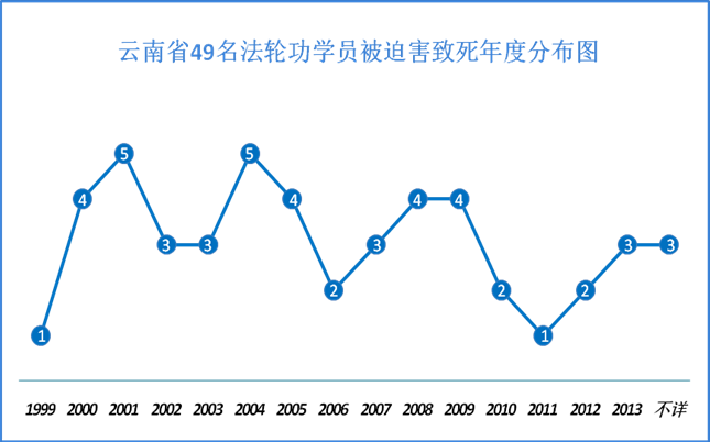 ![]() 图:云南省49名法轮功学员被迫害致死和在迫害中离世的年度分布图 |