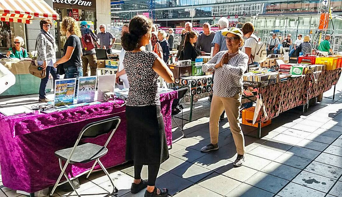 整个书展占地总长度超过一公里,活动主办方特意给法轮功安排了很好的位置。法轮功学员们的展台紧邻市中心地铁站的出口和瑞典最大百货公司的大门口,这里的人流量在市中心几乎是最大的。