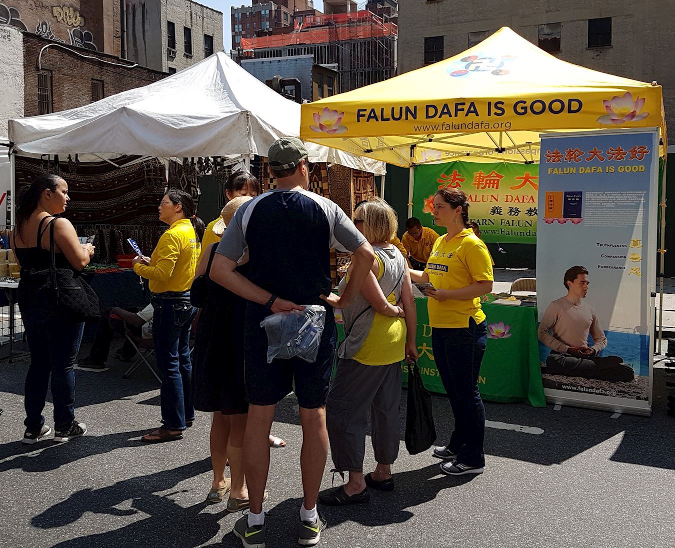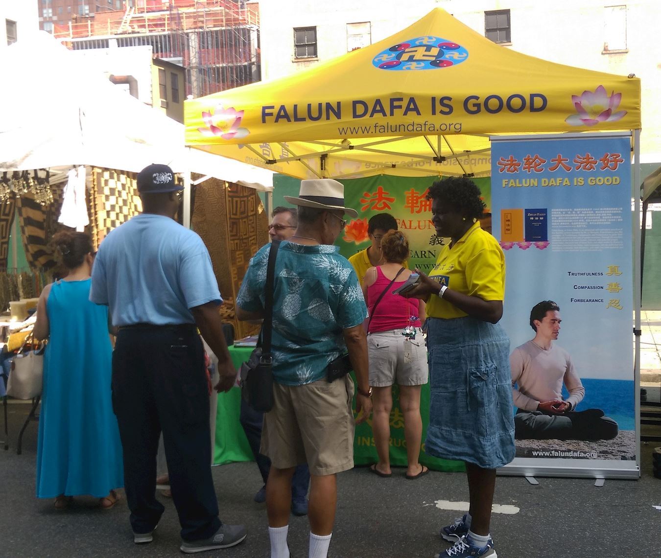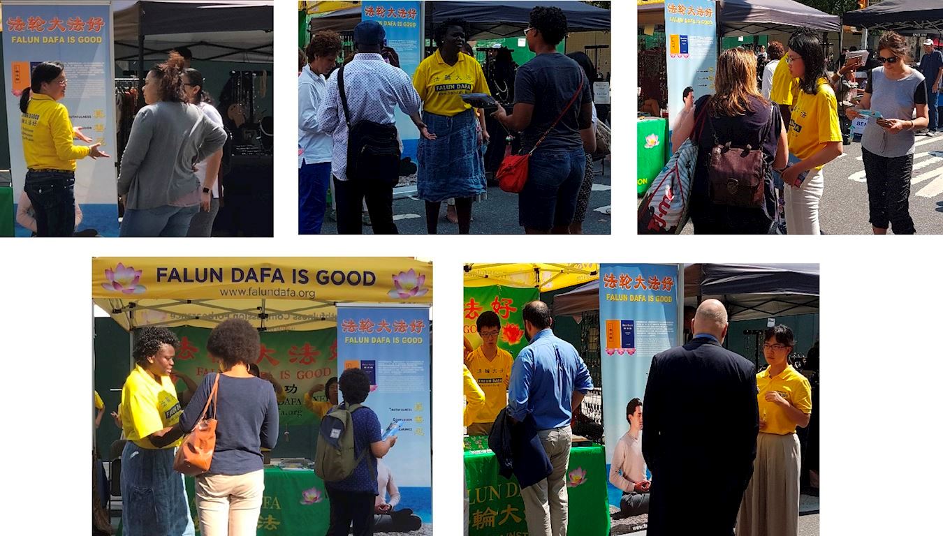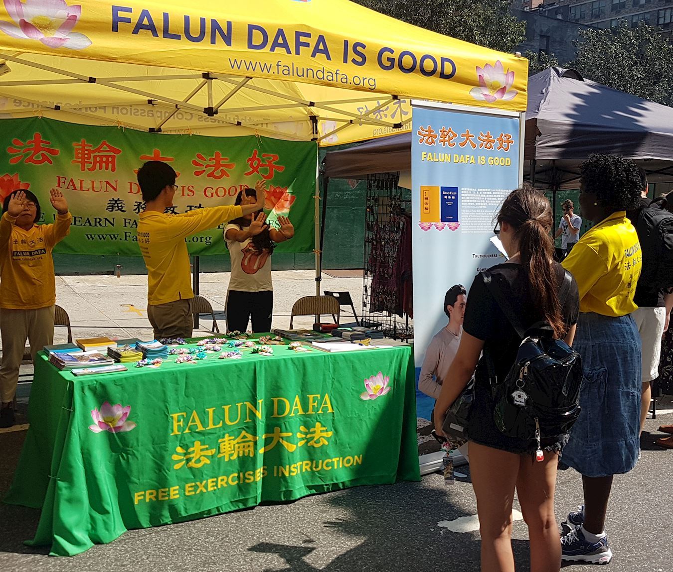 学员们在展位中伴随着炼功音乐,展示五套缓慢圆的功法,热情地跟行人分享法轮功教人按“真、善、忍”做好人,加上通过炼功能使身心受益。