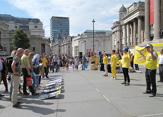 八月二十六日,英国法轮功学员在伦敦特拉法加广场举行讲真相活动。了解真相后的人们说:“谢谢你告诉我这些(法轮功真相),我能做些什么?”
