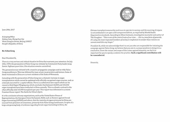 明州参议会议员吉姆·艾伯勒(Jim Abeler)于二零一七年七月起草了一封致中共现任主席习近平的公开信,对在中国发生的针对法轮功学员的大规模迫害表示深切的忧虑。