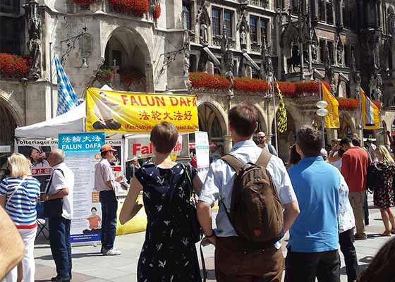 七月二十九日,德国法轮功学员在慕尼黑市政厅前玛琳广场介绍法轮功,揭露中共迫害。了解了真相的大陆游客大声说:“法轮大法好!”