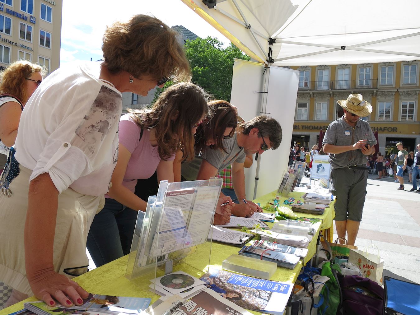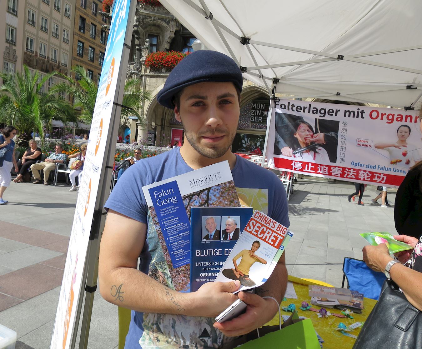 玛琳广场是慕尼黑市政厅所在地,行人如织。人们被法轮功学员的活动吸引,不少人驻足观看,有的当场学功,有的跟法轮功学员交谈,也有的到信息台前了解详情。得知修炼真、善、忍的法轮功学员遭受中共残酷迫害,很多人表示不可思议,尤其是中共活体摘取法轮功学员器官的罪行,更是令人发指。来自世界各地了解了真相的人们纷纷签名谴责中共的罪行。