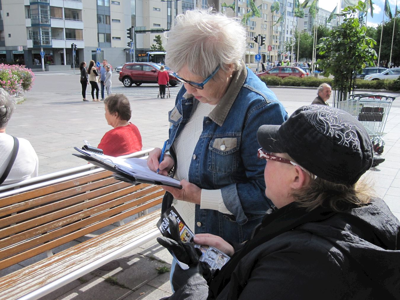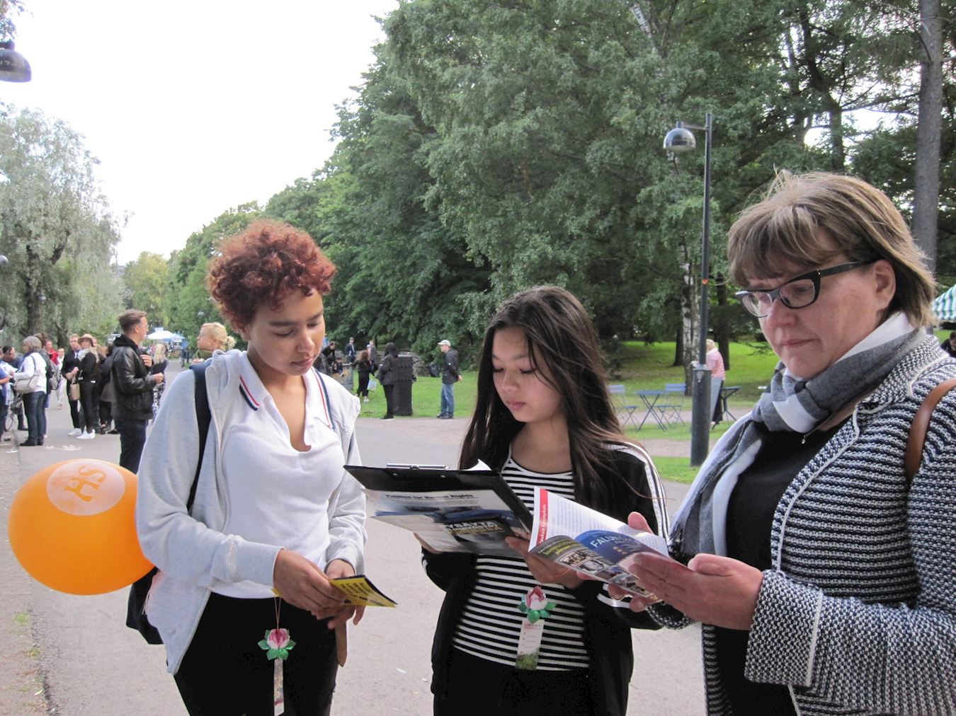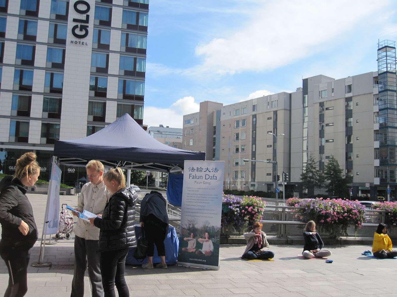 【明慧网二零一七年八月三十日】二零一七年八月二十四日是芬兰的艺术之夜,该艺术节是让民众享受美食和艺术欣赏的活动;同时,二十六日、二十七日天埃斯堡(Espoo)城市日,举办了国际青少年篮球锦标赛、花样滑冰、美食展等系列活动。期间,芬兰的部分法轮功学员也值此机会向民众弘传法轮大法的美好,让陆陆续续到来的市民了解真相后带着喜悦的心情离开。