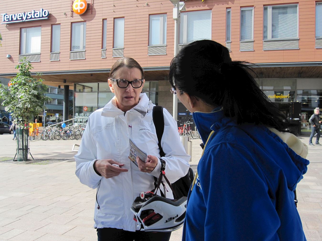 另一位芬兰女士经学员介绍法轮功是一种导人向善,身心受益的功法后,对方感兴趣地跟着学起来。