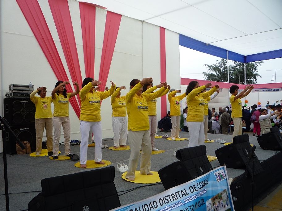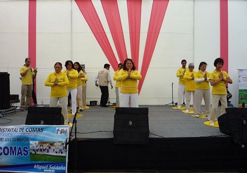 ![]() 图1:秘鲁法轮功学员应国家卫生部的正式邀请,在果玛斯的老人服务日社区活动上介绍功法 |