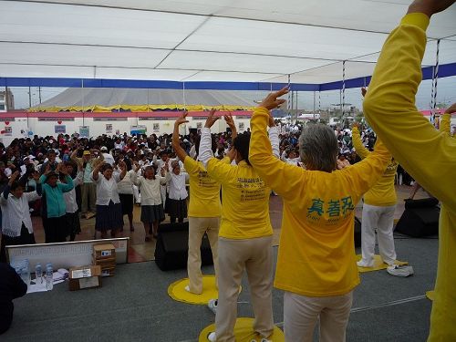 ![]() 图2~3:秘鲁法轮功学员在果玛斯的老人服务日社区活动上演示功法 |