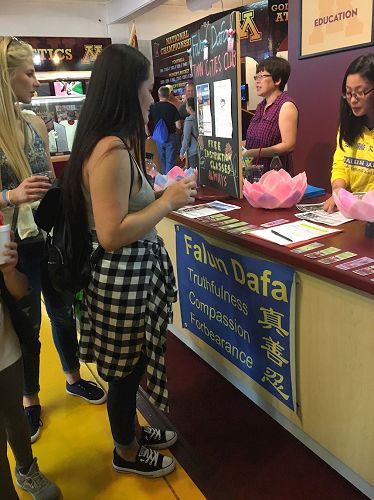 民众在了解到什么是法轮功以后,对每周的免费教功非常感兴趣,对法轮功学生俱乐部将多元文化带进校园表示感谢。一位之前了解法轮功真相的女士在看到法轮功的展位后,特意走过来询问迫害是否已经结束,了解到活摘器官的行为仍在进行时,她非常义愤。