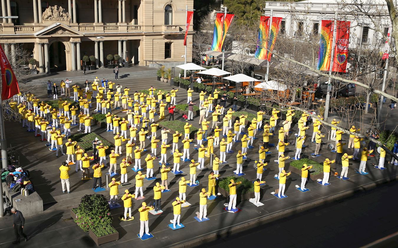 九月八日上午,法轮功学员在位于悉尼环形码头的海关大楼广场进行了大炼功。当时正值交通高峰期,拥挤的人流走出环形码头时,都被眼前的一幕吸引:整齐的黄色衣服和帽子,整齐的队形,舒缓优美的音乐和整齐划一的炼功动作。人们不由的停下脚步,拿出手机拍下这动人的场景。