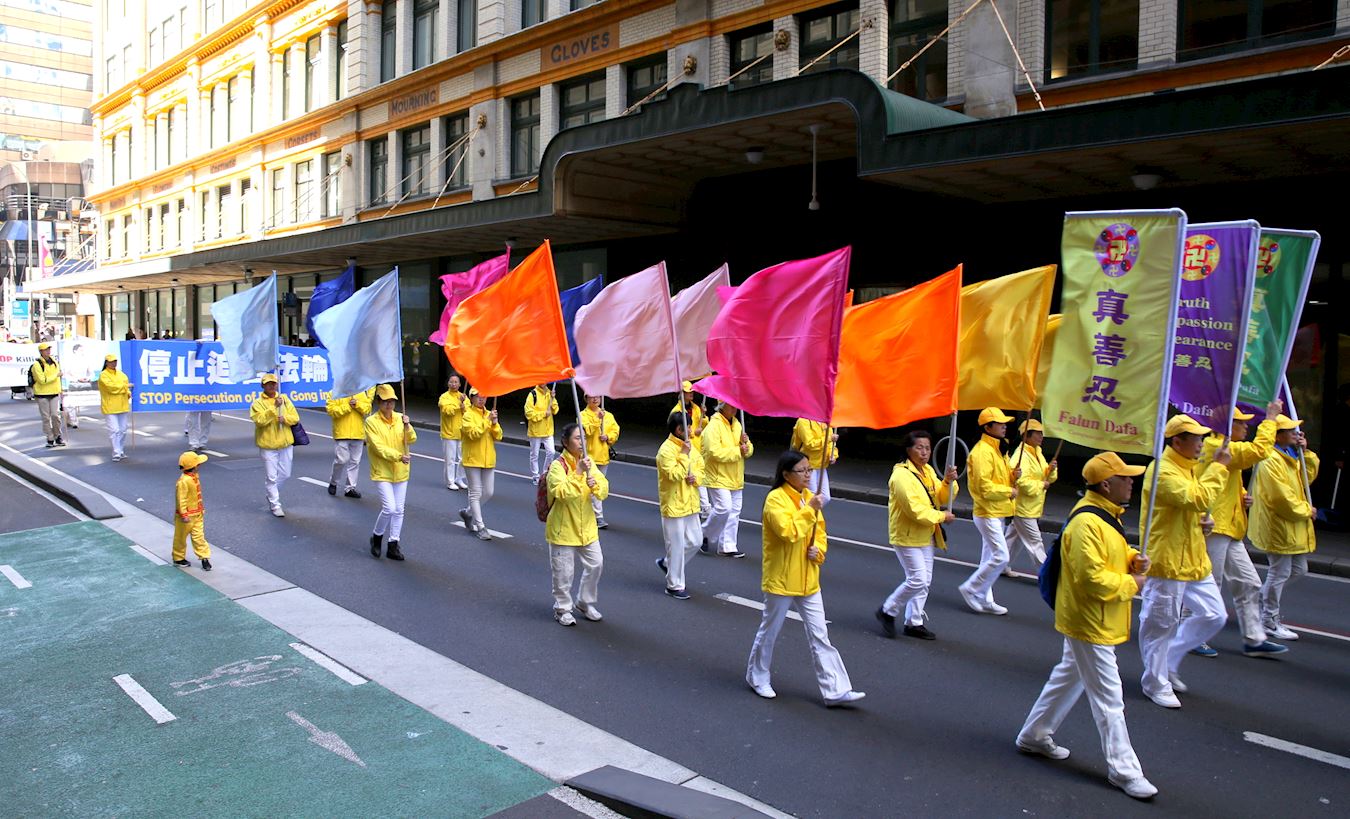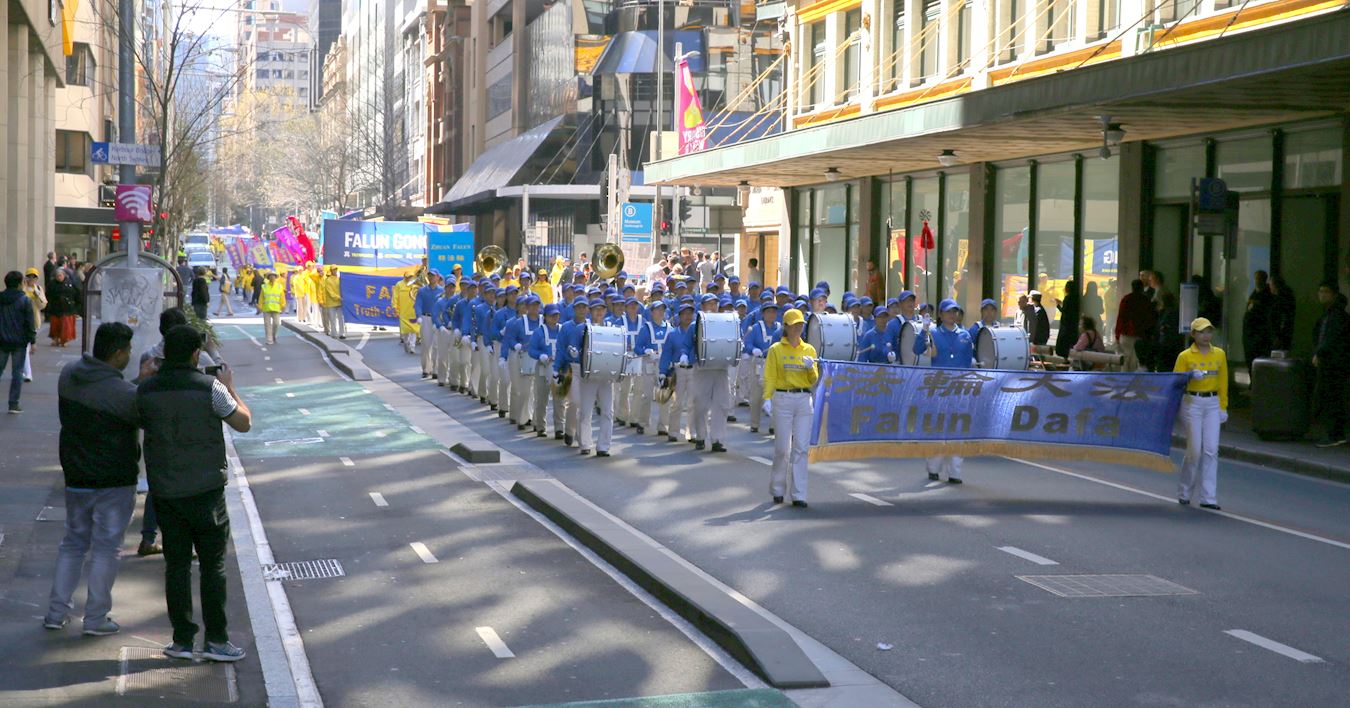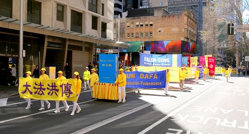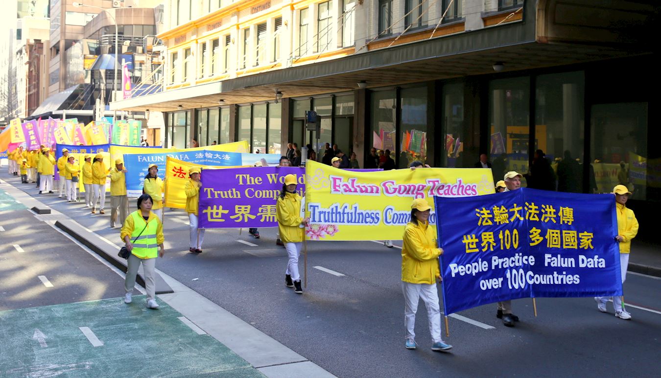 当天中午十二点半,由法轮功学员组成的游行队伍在天国乐团的引领下,展示着“法轮大法好”、“世界需要真善忍”、“停止迫害法轮功”等数百条横幅,及各色彩旗和展牌,从邻近环形码头的杨街(Young St)出发,横跨贯穿悉尼市中心的卡斯而雷街,直至市区的贝尔摩公园(Belmore Park)。一路上,街道两旁的商店员工和街上的行人被法轮功的游行队伍所吸引,很多人站在路边观看,拍照。