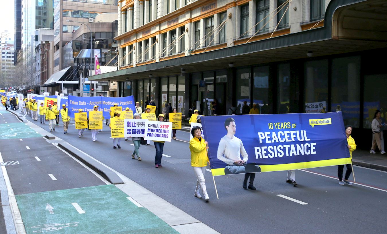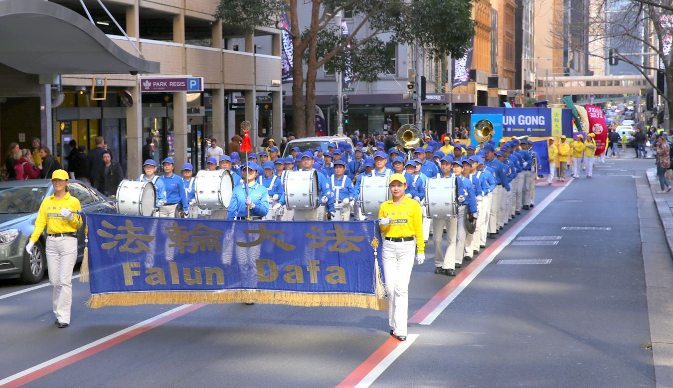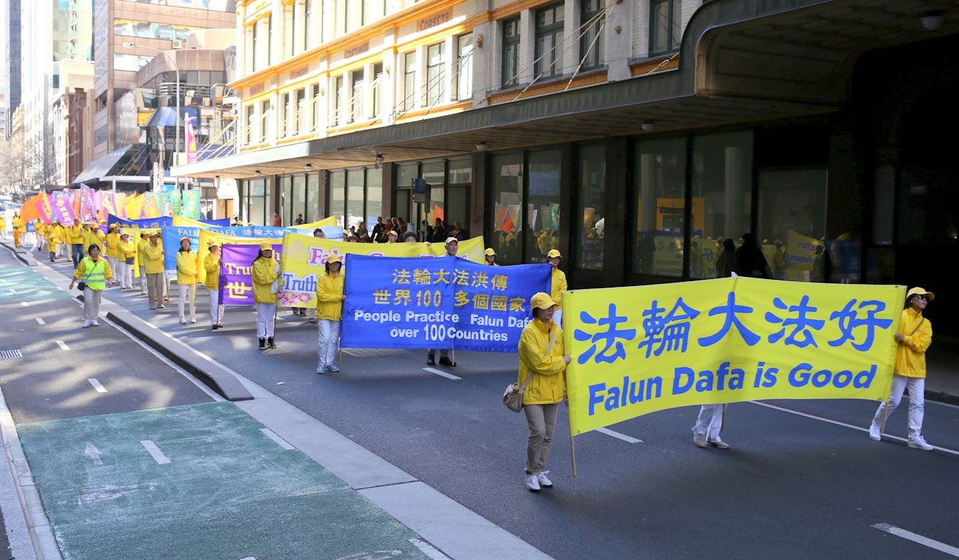 当天中午十二点半,由法轮功学员组成的游行队伍在天国乐团的引领下,展示着“法轮大法好”、“世界需要真善忍”、“停止迫害法轮功”等数百条横幅,及各色彩旗和展牌,从邻近环形码头的杨街(Young St)出发,横跨贯穿悉尼市中心的卡斯而雷街,直至市区的贝尔摩公园(Belmore Park)。一路上,街道两旁的商店员工和街上的行人被法轮功的游行队伍所吸引,很多人站在路边观看,拍照。