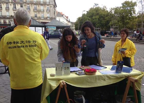 九月二日和九日,法国南部法轮功学员在南特市(Nantes)中心的商业广场进行了介绍法轮功和讲真相的活动。