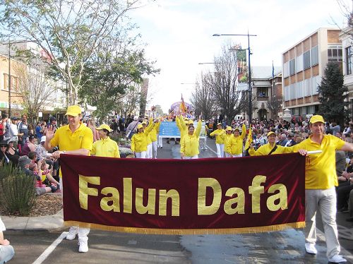 由悉尼和墨尔本法轮功学员组成的天国乐团再次应邀参加了本届花节大游行。他们阵容整齐,服饰亮丽,沿途为数万观众演奏了数首雄壮悦耳的乐曲,包括《法轮大法好》、《法正乾坤》、《法轮圣王》、《欢乐颂》、《送宝》等,赢得观众阵阵掌声和喝彩。