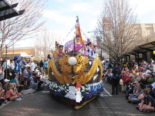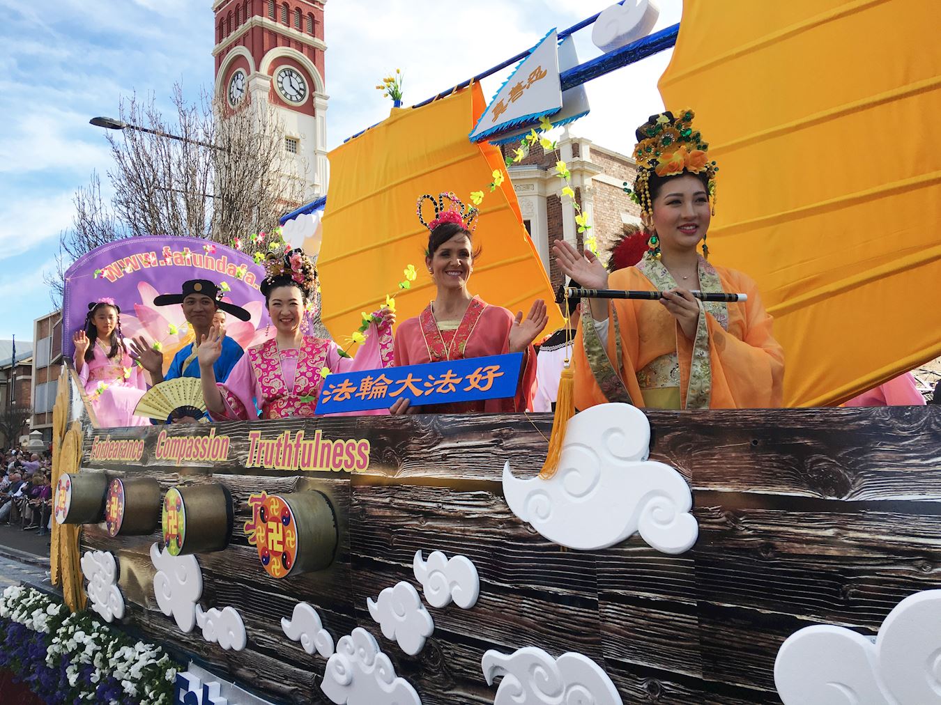 今年参加游行的共有七十多个团体,包括三十四座花车。法轮功学员的花车是一艘硕大的龙舟,船舷两侧各有一条金色的神龙在白云中飞舞,衬托着光彩夺目的法轮和“真善忍”字样,船上有十几名身着古装的仙女和帝王将相。引领花车的是法轮大法旗帜和炼功队。学员们一路与观众热情互动,掌声、喝彩声连成一片。