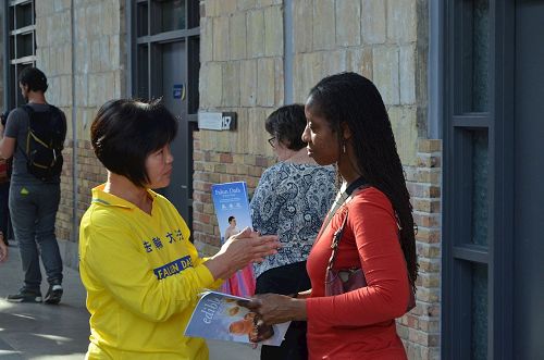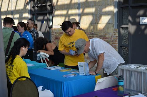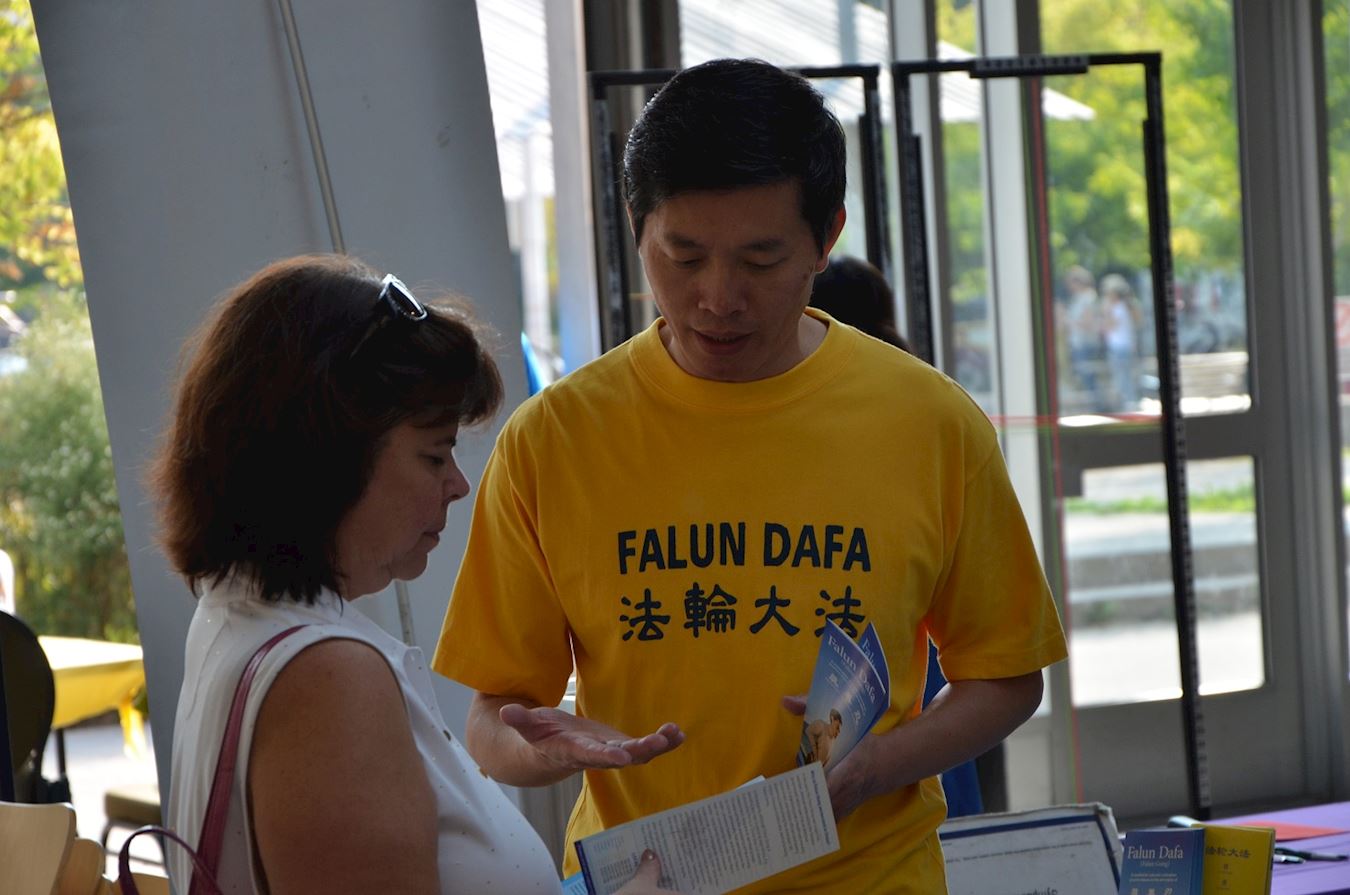 马琳(Marlene)女士在法轮功的展位前停下来仔细阅读介绍法轮功的资料,她告诉学员她是位退休教师,几年前曾经读过法轮功的主要著作《转法轮》,但由于工作忙碌就错过了,她表示今天见到学员很是高兴,她也谢谢学员把法轮功又带到了她的身边。