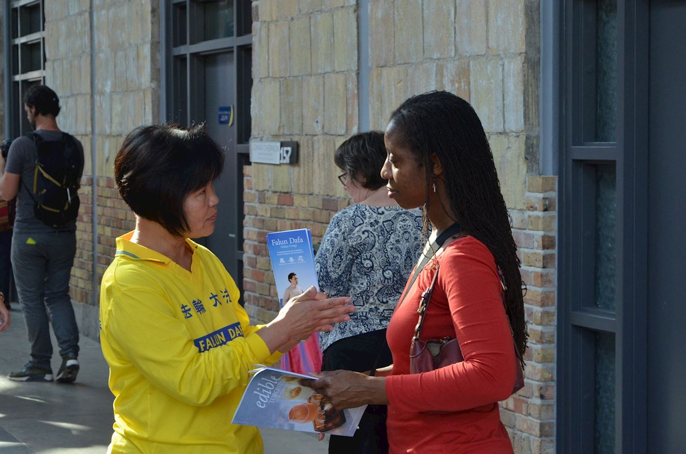 ![]() 图7:志愿者贝尔纳黛特(Bernadette)女士决定也要开始学炼法轮功 |
