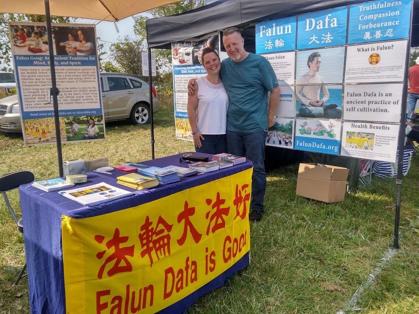 前来参加汽车展的亚当(Adam)和凯西(Kathy)夫妇的摊位紧邻法轮功学员的展位,他们在了解到法轮功不仅在祛病健身方面有神奇功效还提升人们的道德水平,非常热情地帮助学员把介绍法轮功的横幅挂在了他们帐篷上,亚当先生告诉法轮功学员:“把横幅挂的高一点,会让更多的人看到法轮功!”他们还高兴地请学员给他们在横幅前拍照留念。