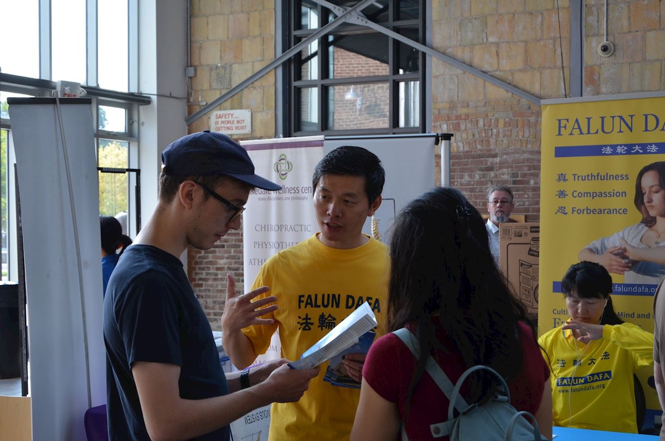 大卫(David)先生看到展会上的法轮功展位就走上前和学员攀谈起来,他告诉学员他家就在多伦多唐人街附近,每天都看到法轮功学员在那里向过往的民众讲述法轮功真相,无论严寒酷暑从来没有停止过,他很钦佩法轮功学员的坚韧,他还告诉学员说:“我知道中共很坏,它迫害法轮功!”