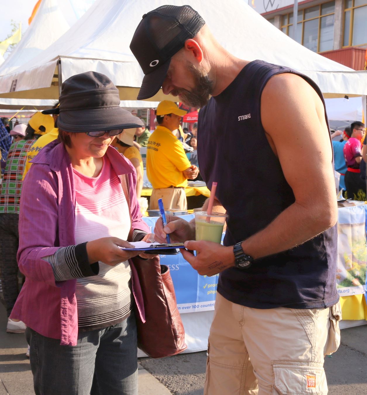 一位名叫海伦(Halen)的越裔华人来到法轮功的摊位问有没有大法书籍。她说她想要读《转法轮》,但她不识中文,想要越文的。法轮功学员便告诉她,可以帮她打听在哪里可以购买越文的《转法轮》,并会打电话告诉她。她高兴地留下了她的电话。