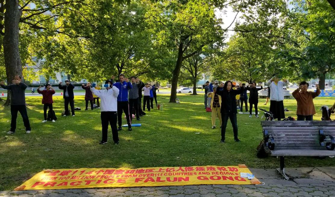 【明慧网二零一七年九月二十九日】(明慧记者章韵多伦多报道)坐落在多伦多市中心的皇后公园(Queen’s Park)是加拿大著名的风景历史名胜,也是北美第一座市立公园。它基本保持着原生态的氛围,娴静、清新,周边的环境也与之呼应。绿草和密林,可以说是它永远的基调。放射状步行道,在枫树、橡树、榆树和白松组成的林间蜿蜒,这里是世界各地游客的必遊景点,同时也是多伦多部分法轮功学员每天必到之处,在这个幽静的环境里,他们在平静地炼功和打坐,还时不时有警察过来巡逻保护他们。