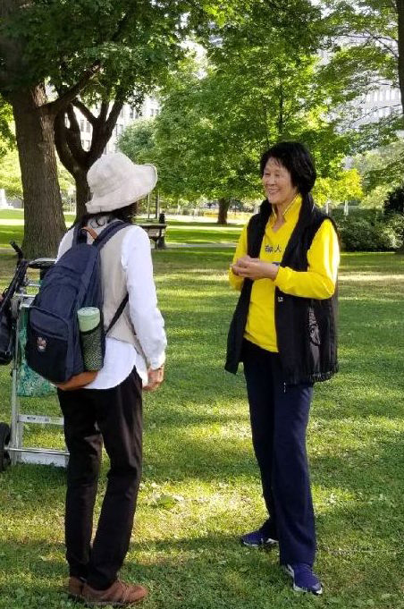 老先生开始点头表示同意了,他上下打量了一下张女士,问她多大年纪了。当张女士说自己快七十岁了,他们全家都瞪着眼睛惊讶地说:“你看上去真年轻啊!”张女士说:“我也是修炼法轮功捡回的命,我知恩图报,我就天天出来跟中国人讲我的受益,把真相告诉他们。”