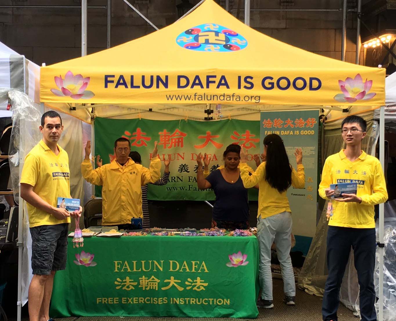 九月三日(周日)在曼哈顿上城举办的一年一度的巴西美食节集市上,汇聚了来自于世界各地的各种美食及小饰品。集市从早晨十点钟开始,因为从一早开始就在持续不断地下着小雨,所以整个集市一眼看去全都是一顶顶白色的小帐篷鳞次栉比。整个集市很长,当游客们走到希尔顿国际酒店的时候,老远就能看到一个明黄色基调的展位,分外的耀眼,几位身穿明黄色炼功服的法轮功学员,伴随着祥和的音乐,展示着优美的五套功法,即使在雨中也格外吸引游客的瞩目。