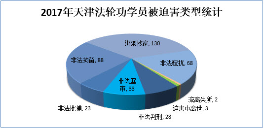 【明慧网二零一八年一月二十七日】(明慧网通讯员天津报道)据明慧网报道统计,二零一七年,天津市法轮功学员被迫害共计375人次,其中非法判刑28人次(包括二审维持冤判4人);非法庭审33人次;非法批捕23人;绑架抄家130人次;非法拘留88人;骚扰68人次;迫害中离世3人;迫害中流离失所2人。