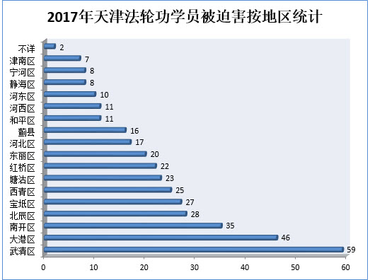 二零一七年,天津市武清、大港、南开三个区迫害法轮功学员案例最多,合计140人次,占比全市迫害总数的38%,而武清区连续三年成为迫害法轮功学员最为严重的地区。