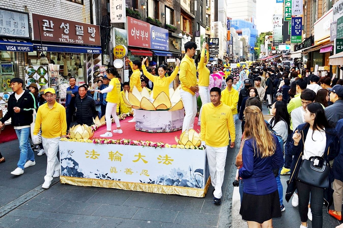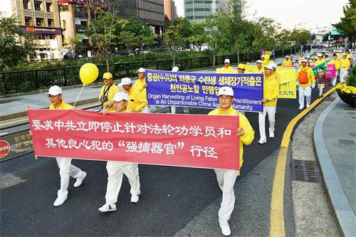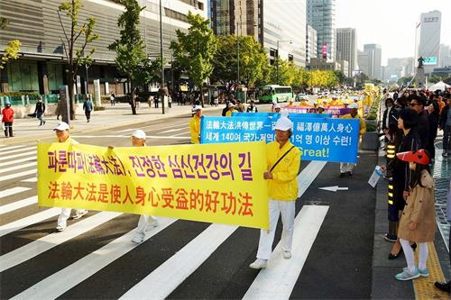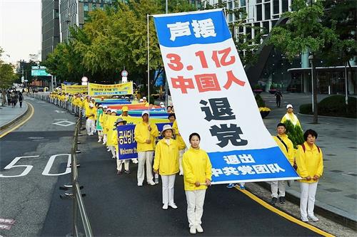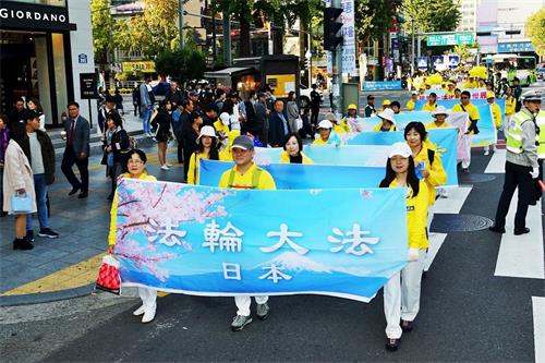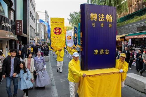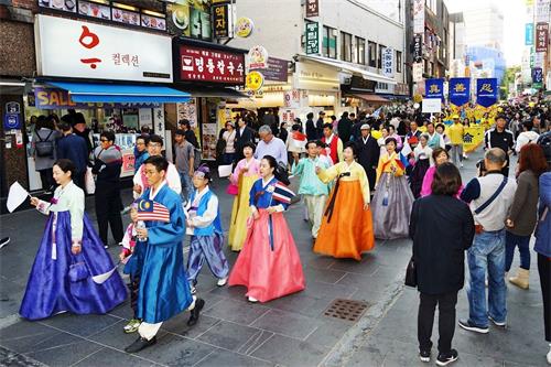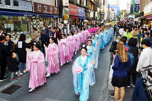 壮观绵延的游行队伍引起大陆游客和韩国行人的震撼。
