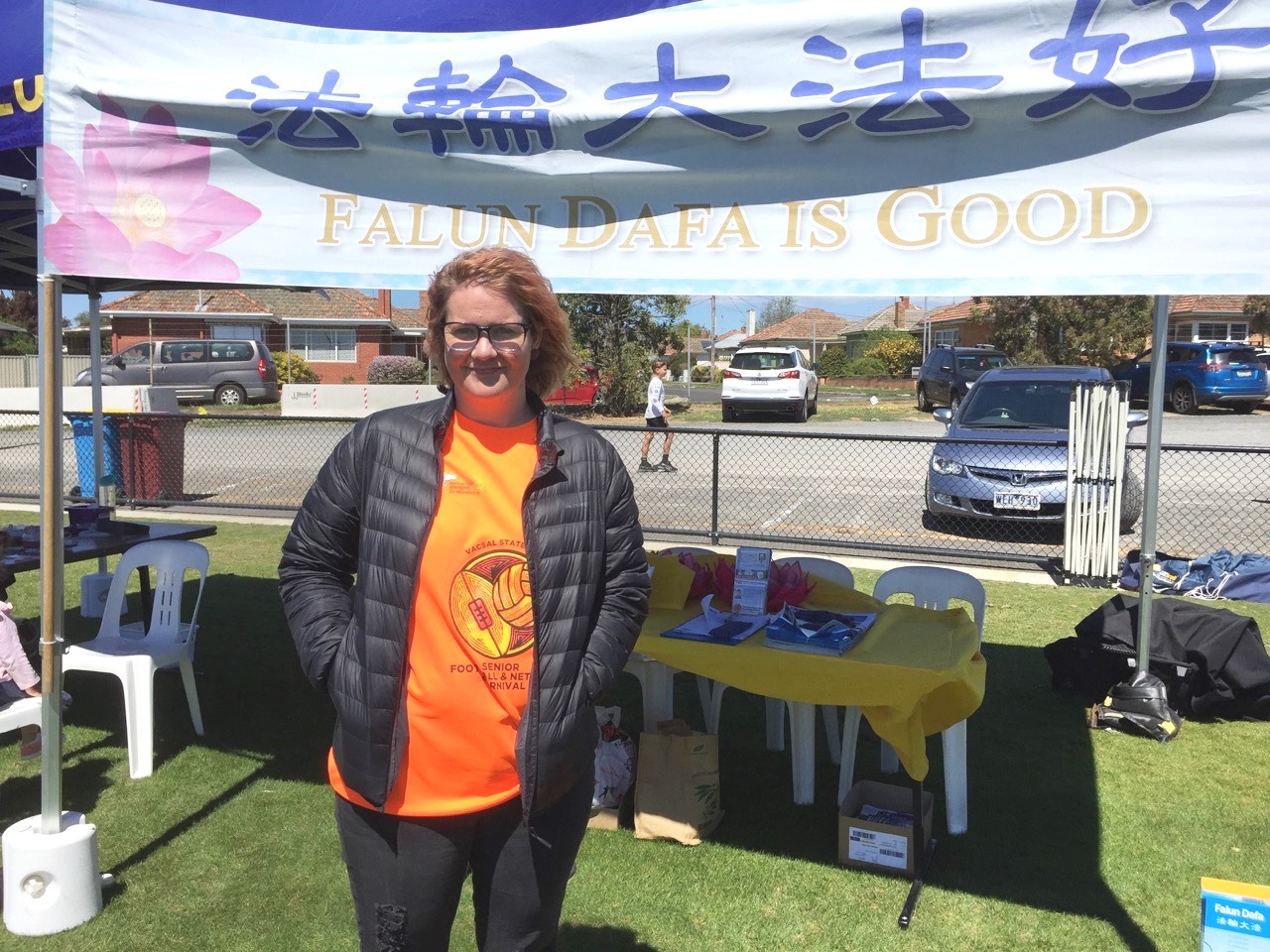 活动主办方的工作人员、维州社区健康服务机构的社工洛弗尔(Naomi Lovell)女士,被法轮功学员的功法展示深深吸引,主动前来了解详情。