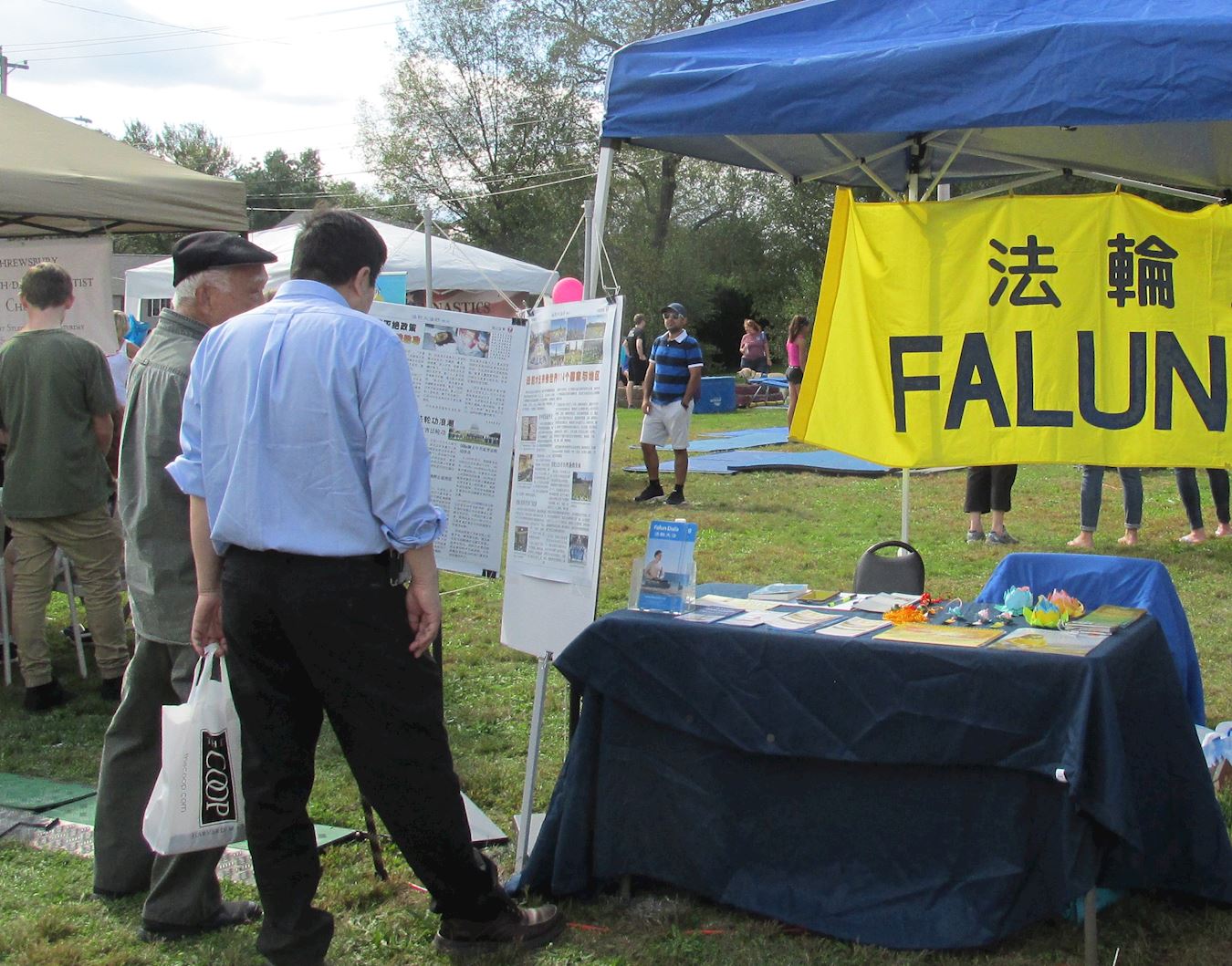 【明慧网二零一八年十月二日】二零一八年九月二十九日,美国麻萨诸塞州舒士伯市一年一度的秋季丰收节在市中心附近的一所中学校园内举行了展览会,吸引了约两千当地民众。现场有一百多个商家和非营利机构参展,法轮功学员也摆设了展位,演示五套功法,并向人们介绍法轮功的特点,及在中国无辜遭受迫害的真实情况。