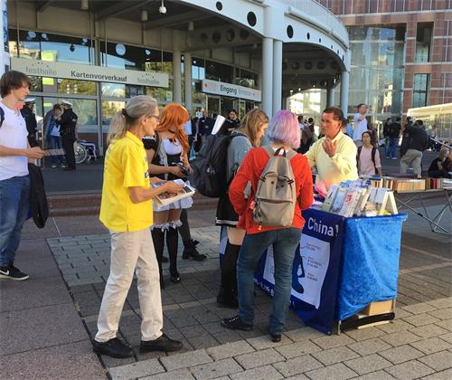 书展期间,法轮功学员每天在展会主馆前广场的书市上和附近的交通要道旁,以及在市中心最繁华的柏林大道边同时举办法轮功咨询活动,不同民族、不同国家的参观者、游人以及德国各地民众都有机会了解到法轮大法的美好以及中共十九年来残酷迫害法轮功学员的真实情况,其中不乏中国人。
