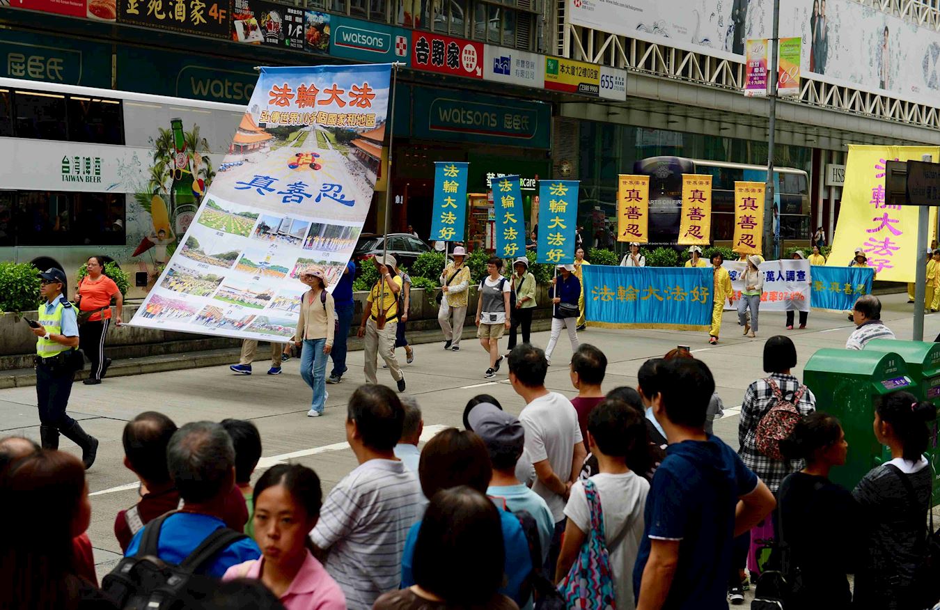 集会结束后,近千人的游行队伍下午近二时由长沙湾游乐场出发,在天国乐团以雄壮奏乐领头下,途经九龙区繁华闹市,到达终点尖沙咀码头。历时约三个小时。游行分为五大方阵,包括“除恶扬善 天下太平”、“法轮大法和平之路”、“天灭中共 三退是福”等,通过各式幡旗横幅与展板海报,衬以腰鼓队、旗鼓队等奏乐,展现法轮大法的美好,揭露中共的迫害。壮观的游行队伍,沿路吸引成千上万的中外民众观看,很多人拿起手机拍照录像,不少大陆游客即时向三退义工表明退出中共党、团、队。