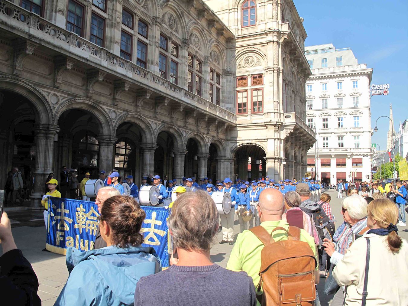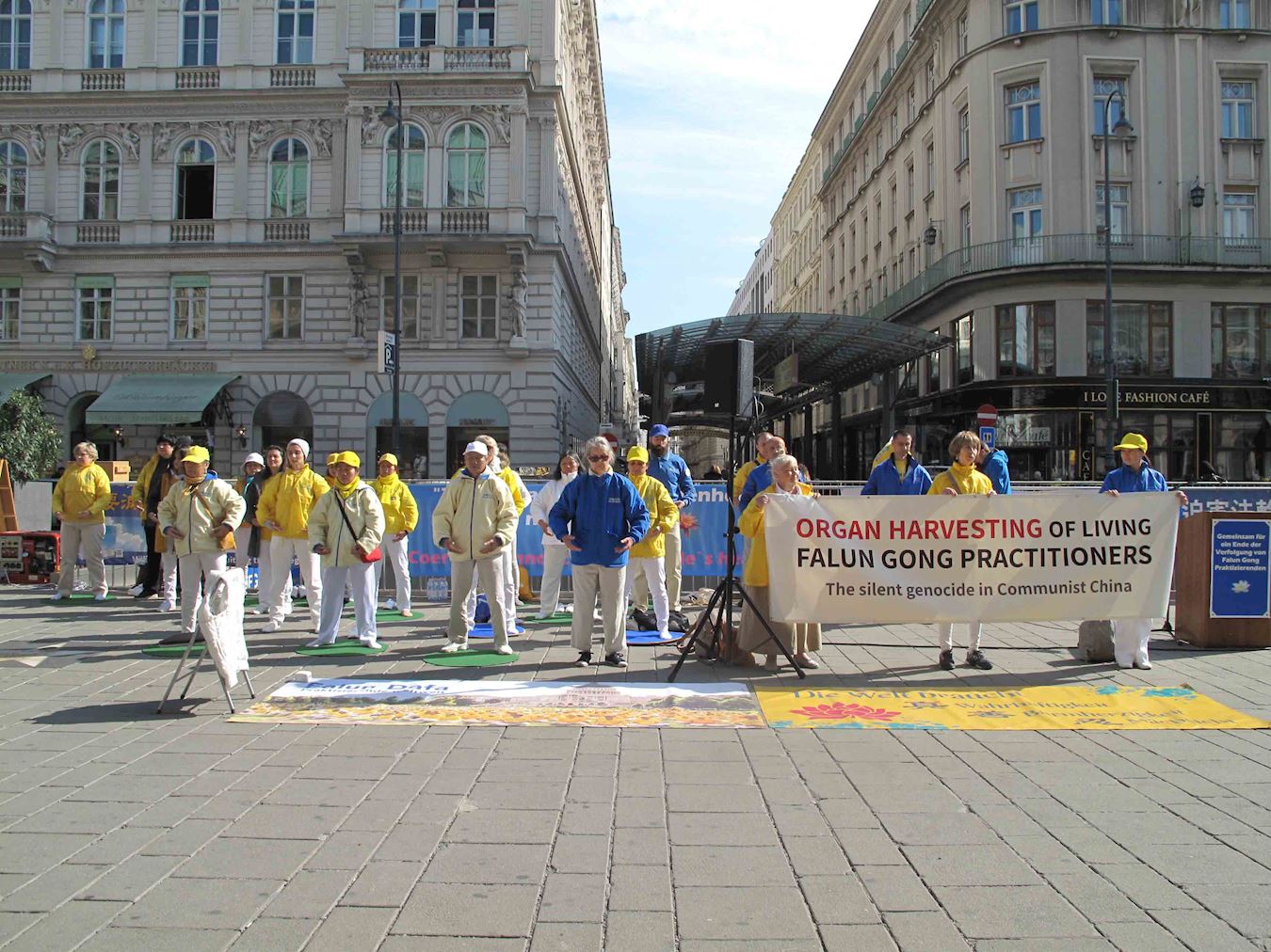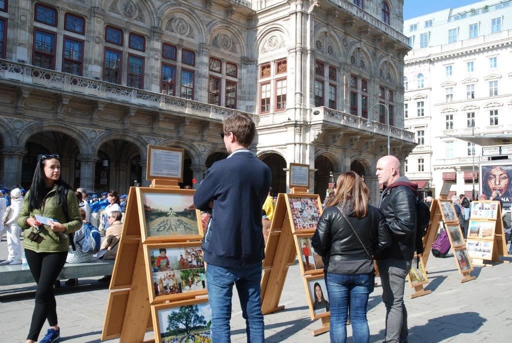 维也纳正是秋高气爽时节,中午时分国立歌剧院和边上的卡拉扬广场(Karajan platz)上,已有络绎不绝的观光客和旅游团。法轮功学员在卡拉扬广场和歌剧院毗邻的一侧举办集会,由天国乐团、肃穆的白衣悼念组、祥和的黄衣功法演示组、真相点、演讲台和图片展组成。