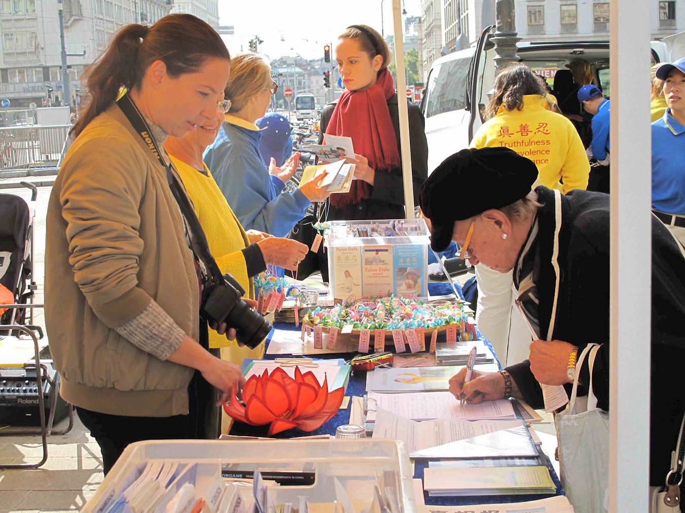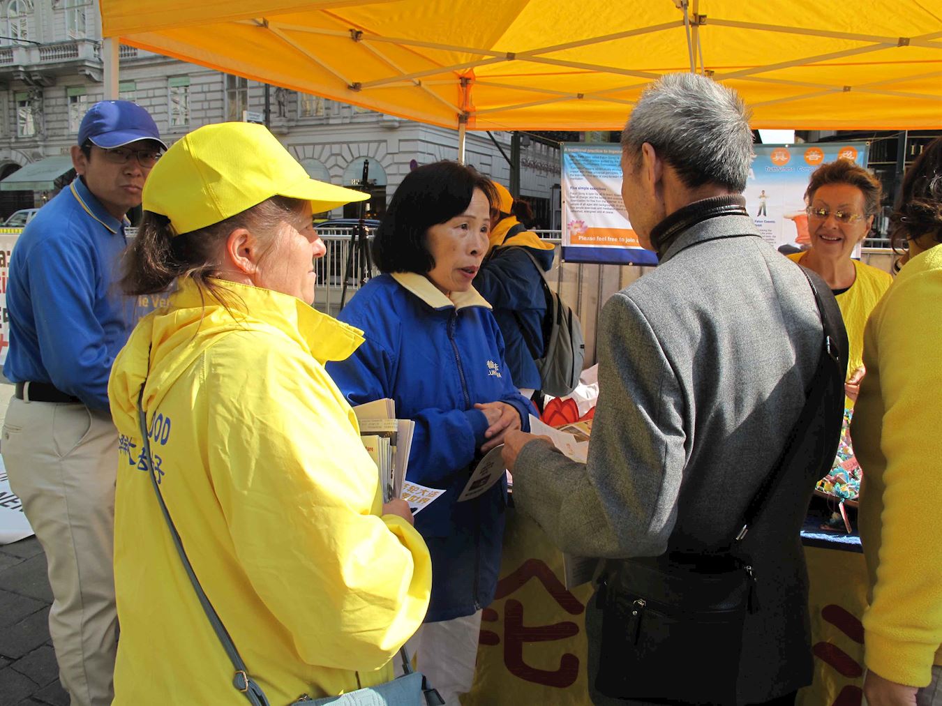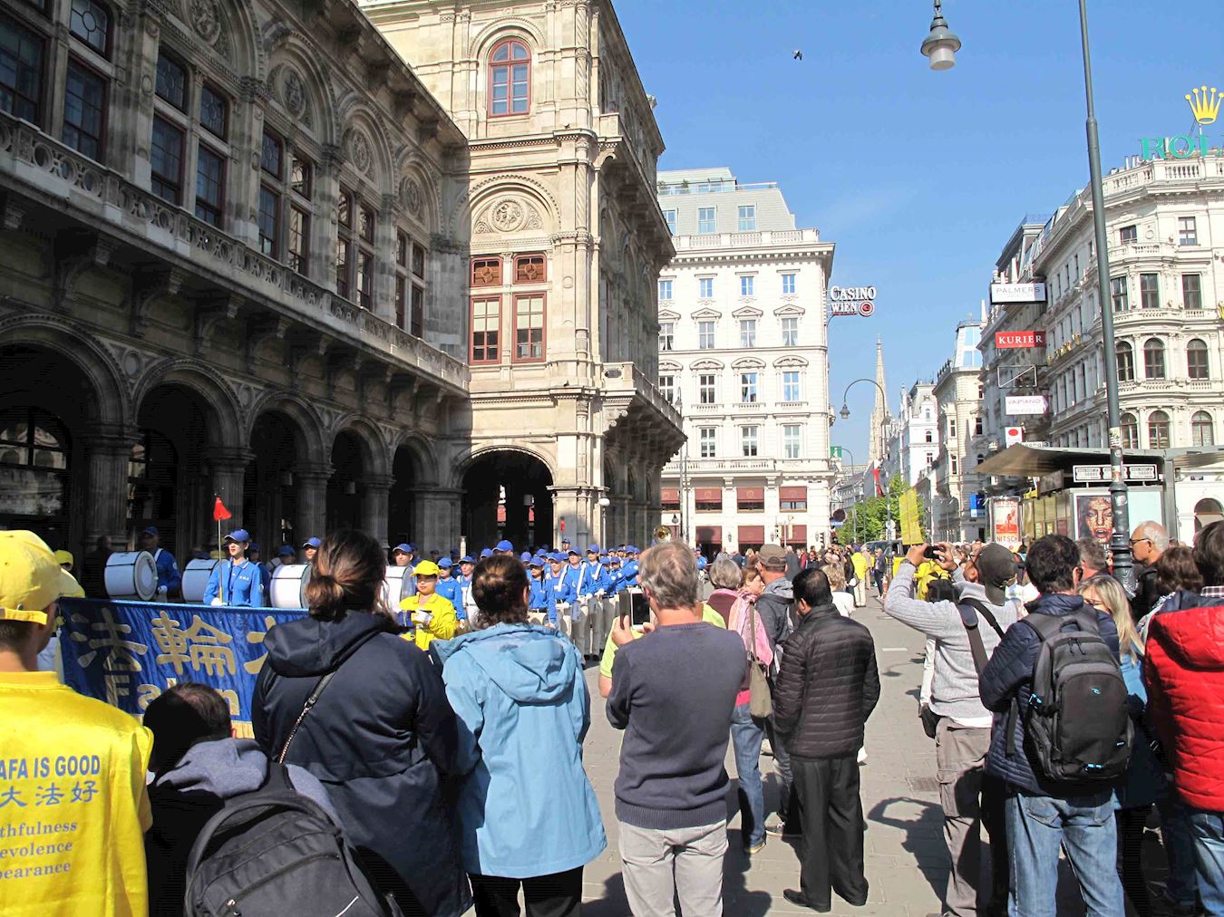 维也纳正是秋高气爽时节,中午时分国立歌剧院和边上的卡拉扬广场(Karajan platz)上,已有络绎不绝的观光客和旅游团。法轮功学员在卡拉扬广场和歌剧院毗邻的一侧举办集会,由天国乐团、肃穆的白衣悼念组、祥和的黄衣功法演示组、真相点、演讲台和图片展组成。
