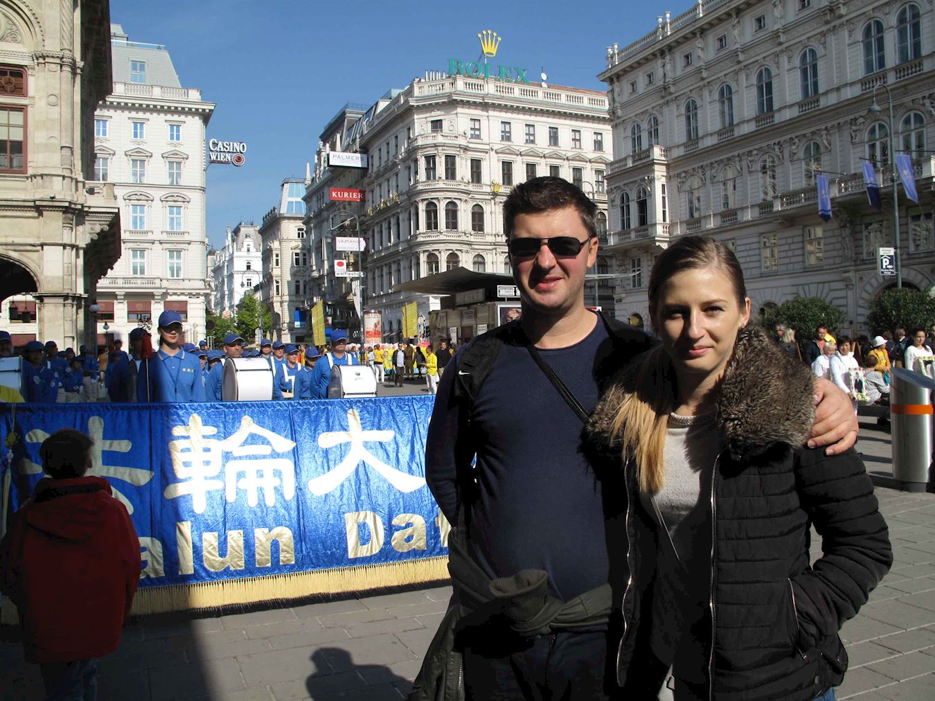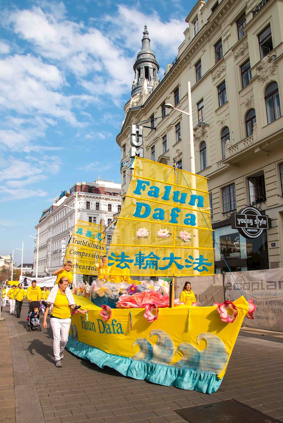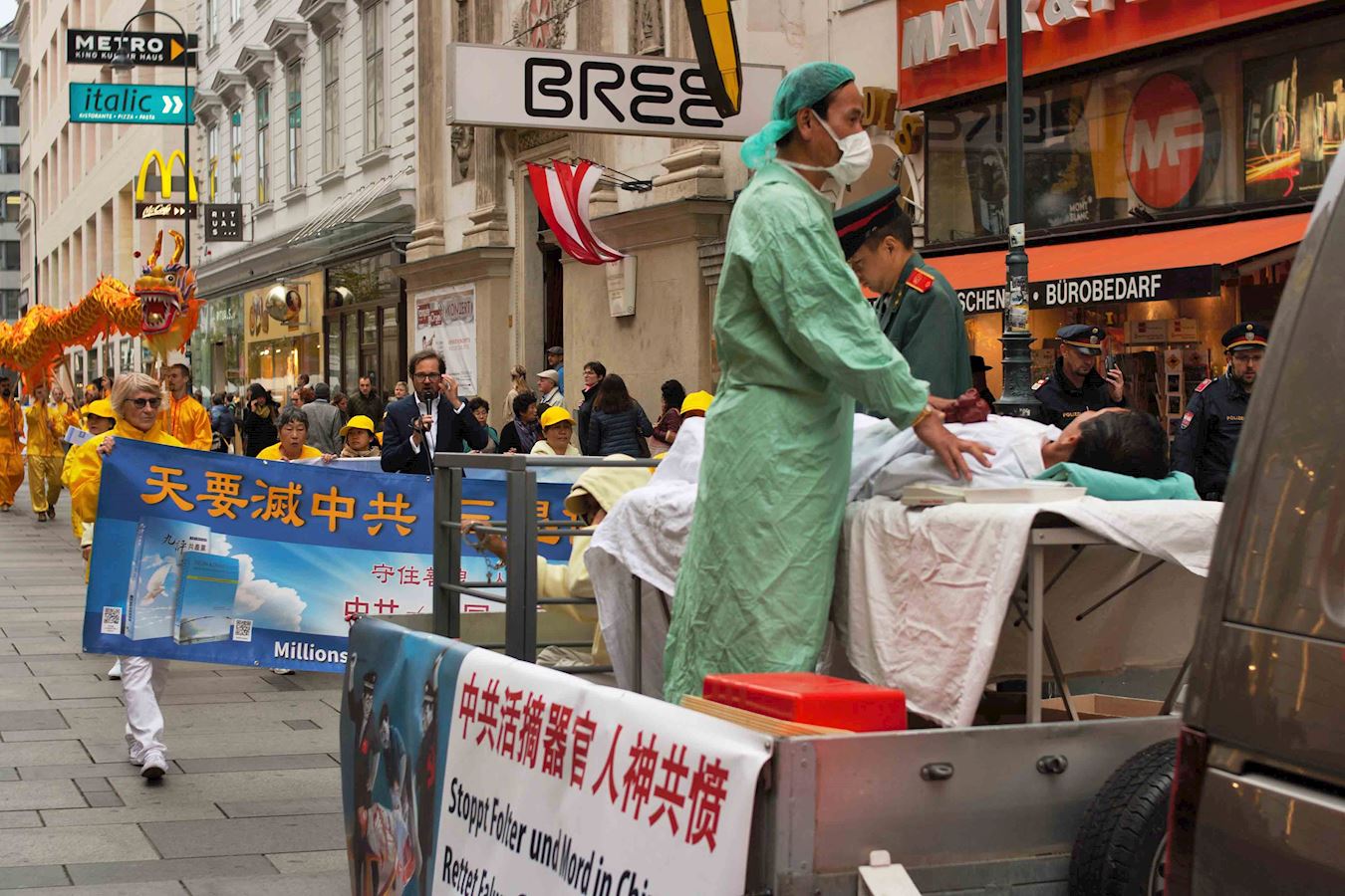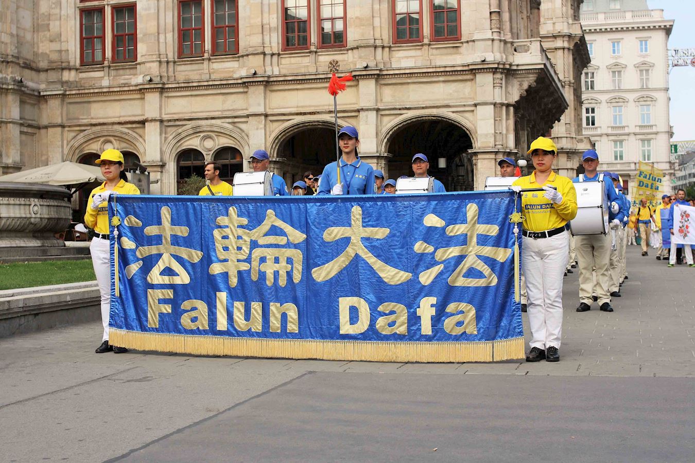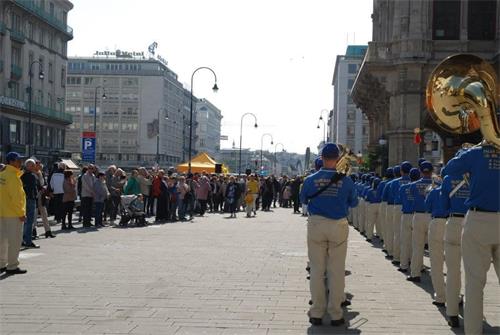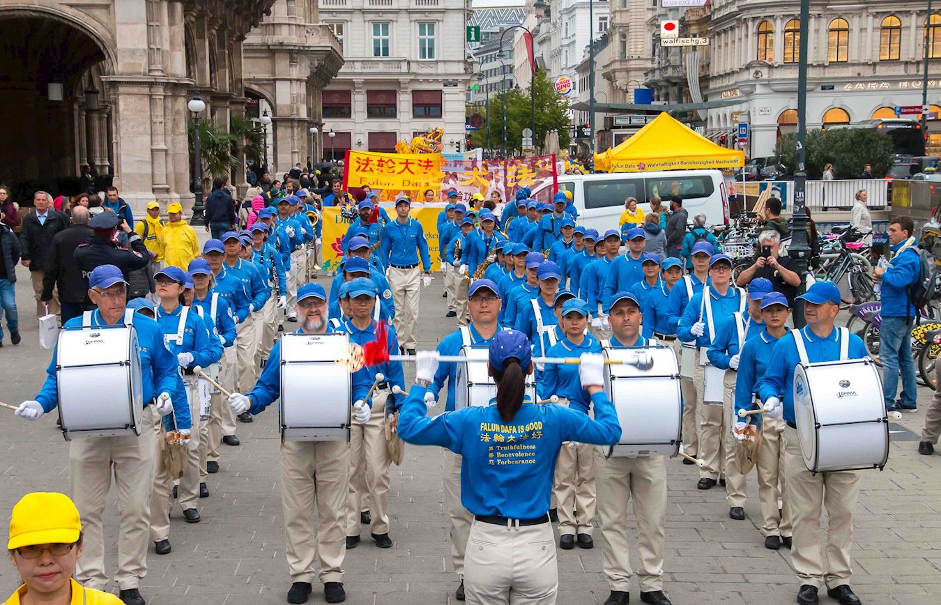 集会过后,法轮功学员的队伍由天国乐团开道,穿过这座世界音乐之都。他们经过霍夫堡王宫、艺术史博物馆、最重要的政府机构以及游客最多的购物街。游行过程中,活动主持人弗洛里安(Florian)站在模拟活摘罪行的车后面一路拿着麦克向沿路民众用英德双语讲述真相,一方面告诉人们法轮功教人真善忍,是修炼,另一方面揭露中共的残酷迫害。