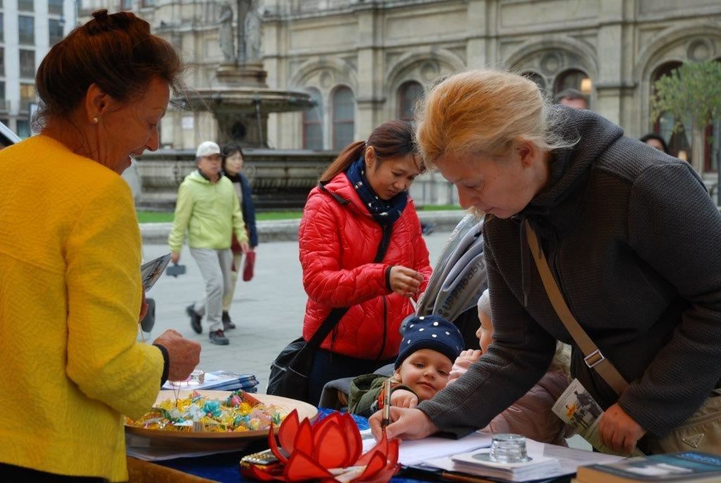 一位维也纳的华人学员向他介绍了什么是法轮功,以及两天前有一千多名法轮功聚集布拉格举办大型活动。他很吃惊表示要去找当地炼功点。当学员和他说到天灭中共三退保平安的时候,他说他看过《九评共产党》,很清楚中共的邪恶本质。