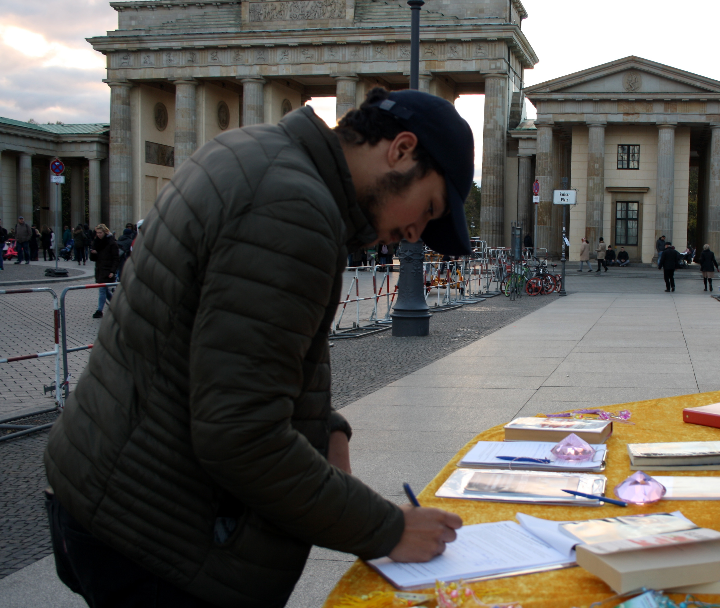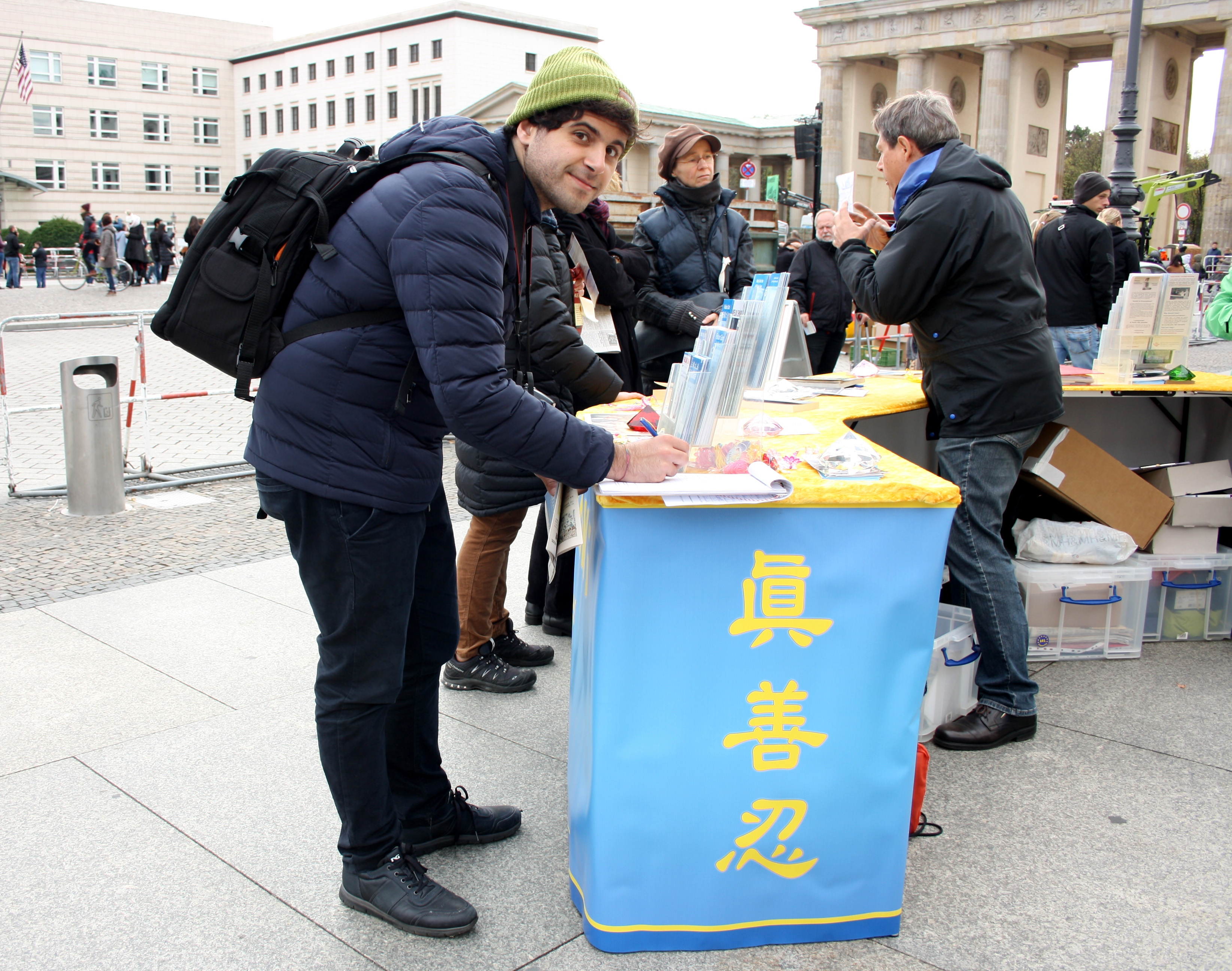 来自伦敦的Samy也来声援中国的法轮功学员,他用英语问,“我在哪里可以签名?”他曾在伦敦的唐人街看过反活摘的信息展位。“我看到人们经过那个展位,也有人停下来阅读横幅,想要了解更多关于世界另一端发生的事情。”在柏林看到展位后提醒了他,便立刻走过来找法轮功学员。