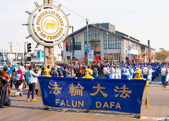 十一月十一日,再次应邀参加旧金山老兵节游行的法轮功学员的队伍所到之处,赞叹声不绝,连维持秩序的交通警察也为法轮功学员喝彩鼓掌。