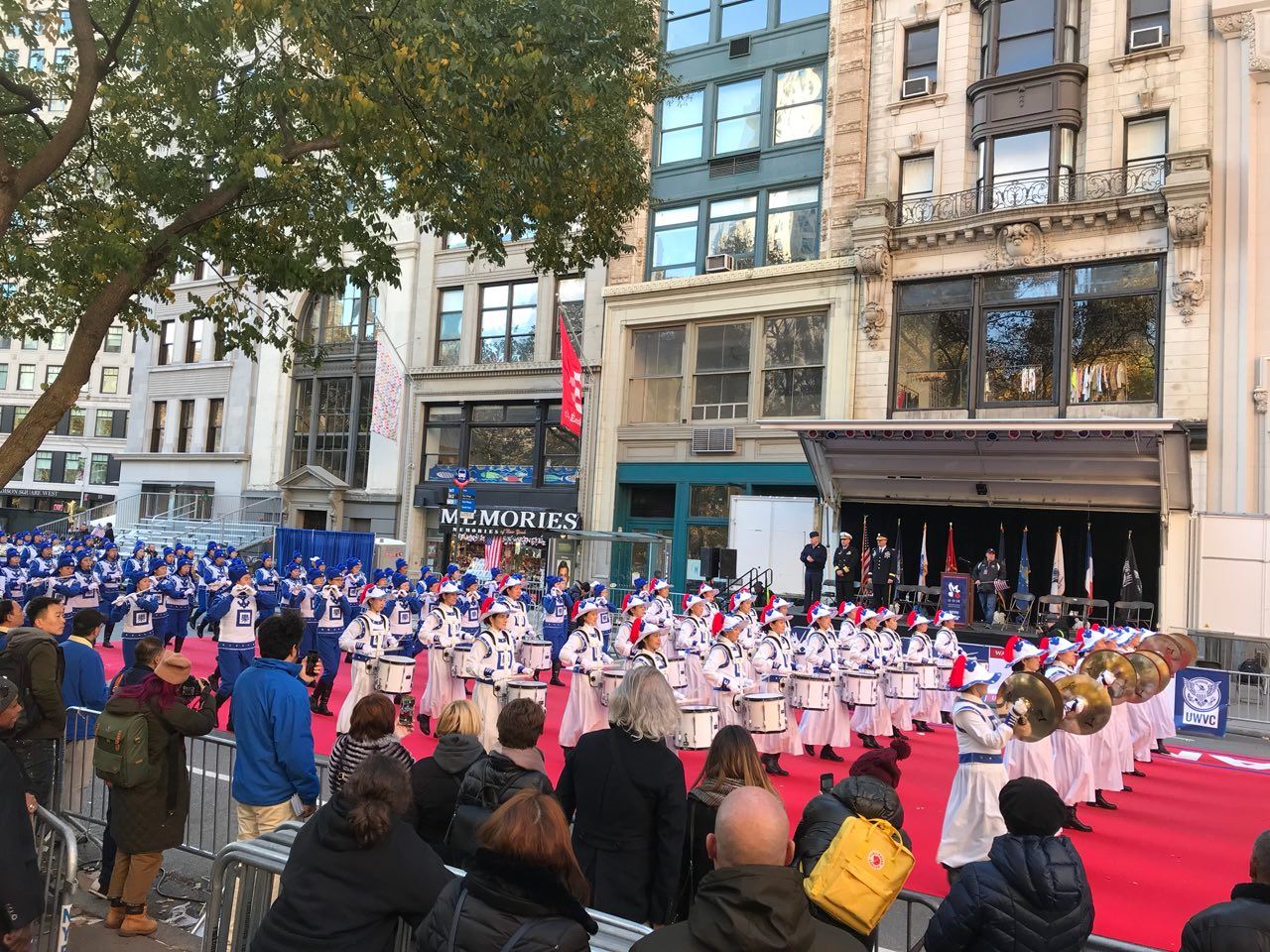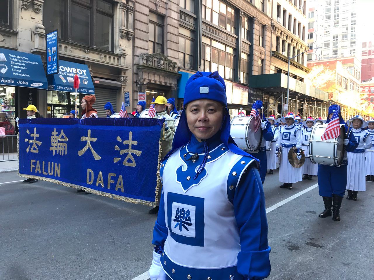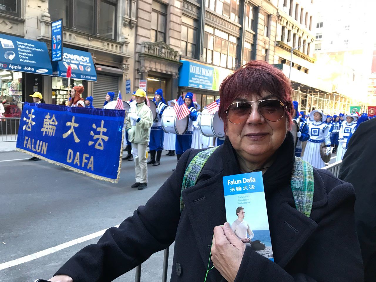 天国乐团的指挥周雯雯女士表示,法轮功的天国乐团用军乐队以音乐的形式来庆祝这个节日,同时把法轮大法“真、善、忍”的美好带给曼哈顿人民。“今天我们带来了经典曲目——‘法轮大法好’、‘凯旋’、‘神圣的歌’,另外我们还特别准备了美国国家进行曲《星条旗永不落》(The Stars and Stripes Forever),这个曲子吹起来难度较大,我们排练了很长时间,真心献给纽约老兵节,”周雯雯说:“借此向退伍军人、特别是参加过历次战争的退伍军人表达敬意,同时希望美国强大平安。”
